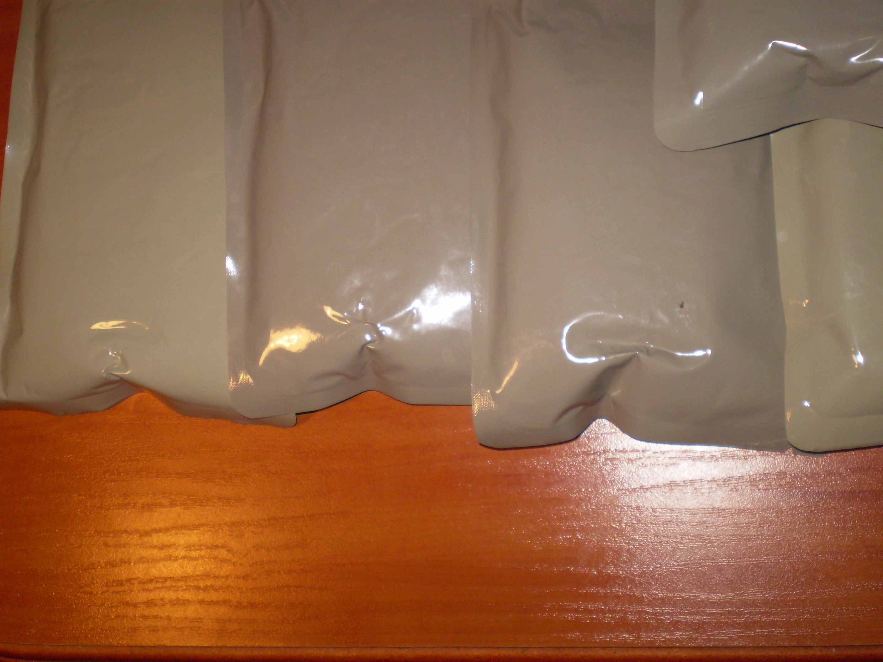 I checked them again yesterday in bright sunlight.Well...I decided not to "torture" the pouches.I know that they should endure 1000 flexes but I don't want to test them to their limits.I'm gonna eat Feta Chicken first.Anyway,this wouldn't be a problem if MREs were always available here.But they aren't, at least for such a good price.There is also a Ratatuille menu in the shop but it's outer bag is cut and there's a 1cmx1cm hole...