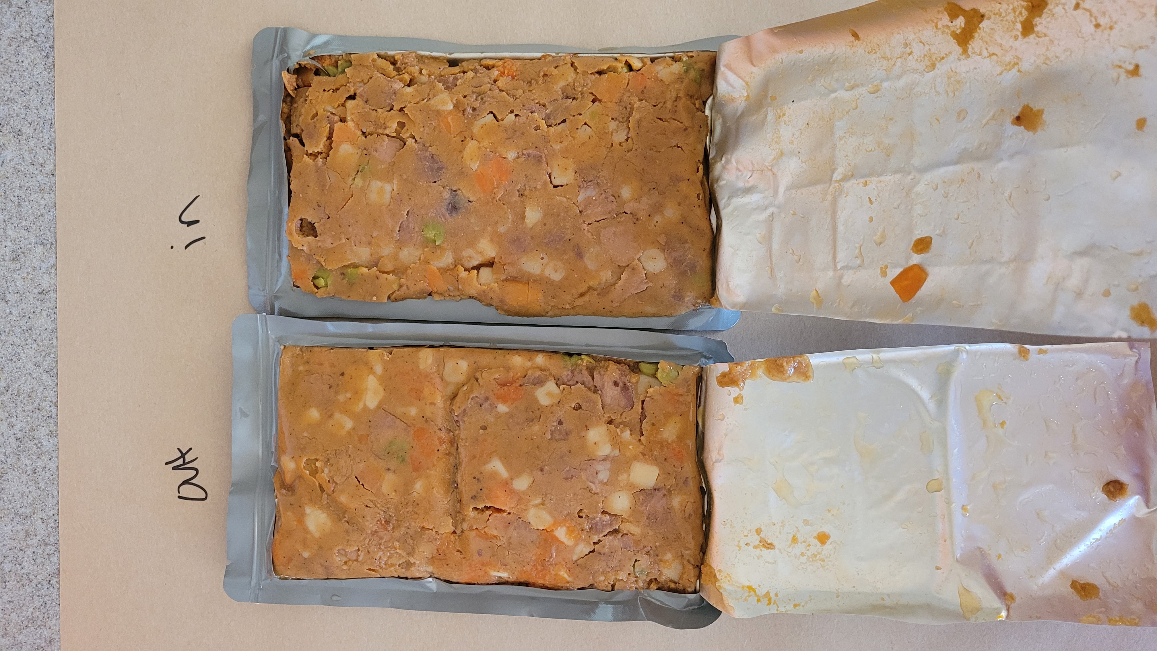 We tried them right out of the retort pouch and then heated them up to see if there was a difference. They were definitely better heated but each tasted the same. The mains that sat outside had a slightly different texture, not bad or good just different.