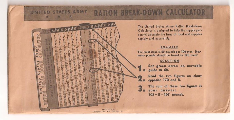 Ration Break-Down Calculator for Army 'A' rations. 1940's ?