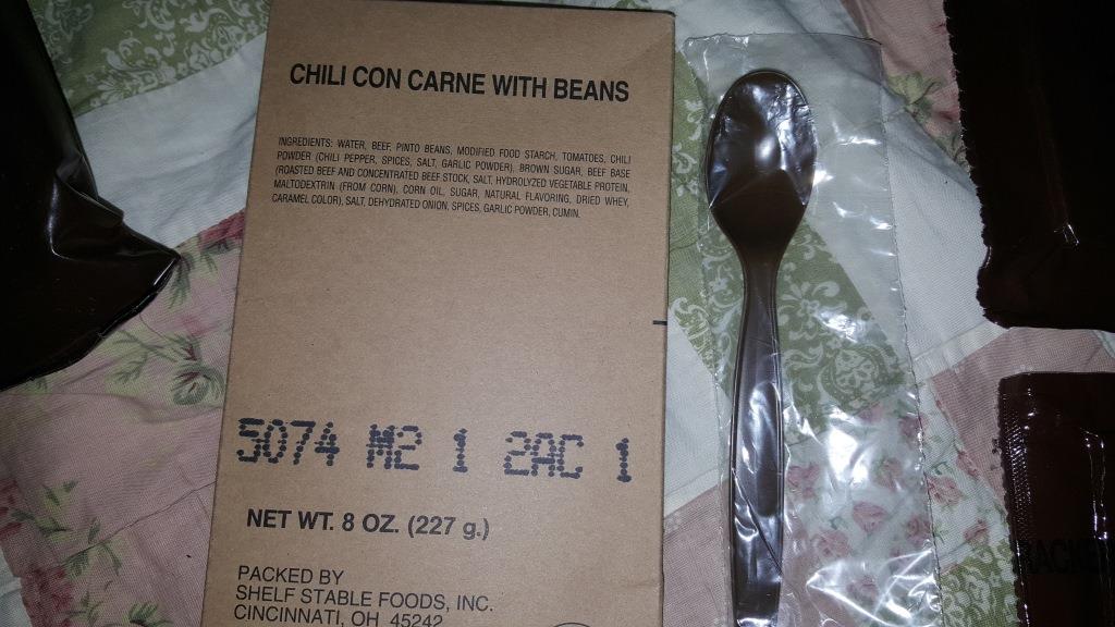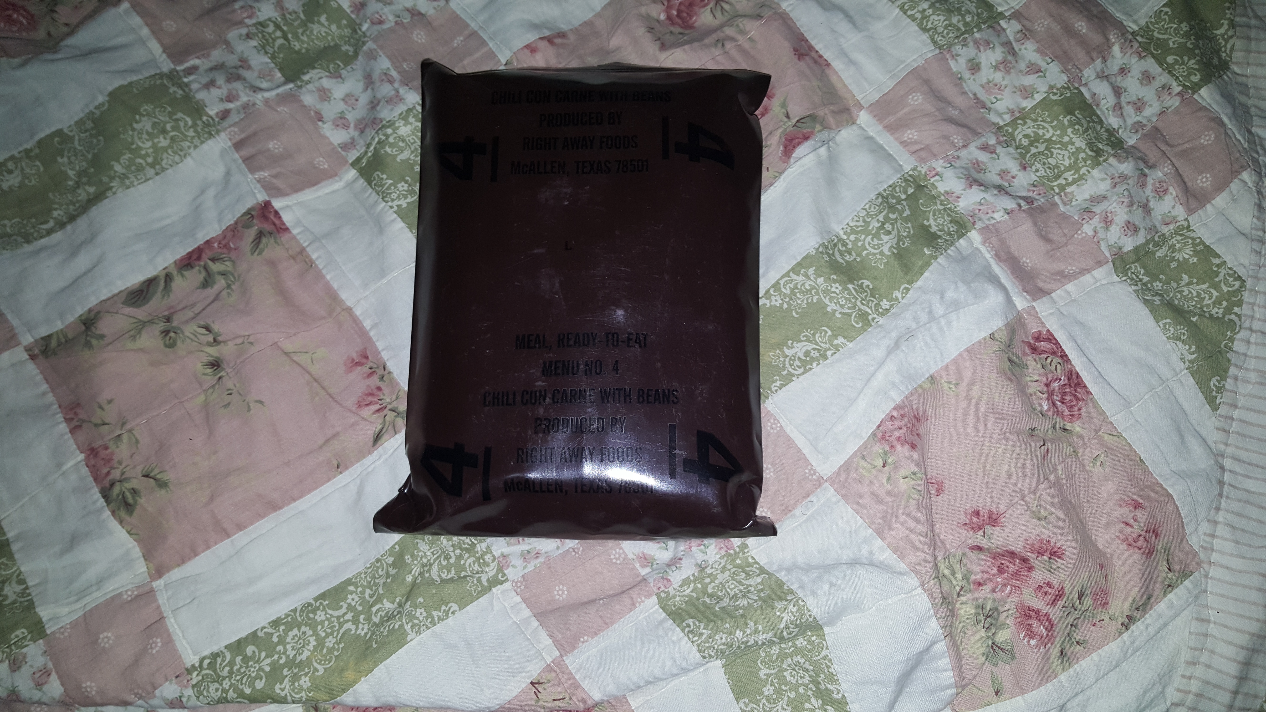Hello! I have something of an oddity for all of you to see. First of all, I noticed that this menu wasn't listed anywhere in the MRE Menus section, which is why I was intrigued by it. I felt it was worth the price I overpaid for it (I have another) so I could document it. This is a 1995 Chili Con Carne with Beans from Right Away Foods.