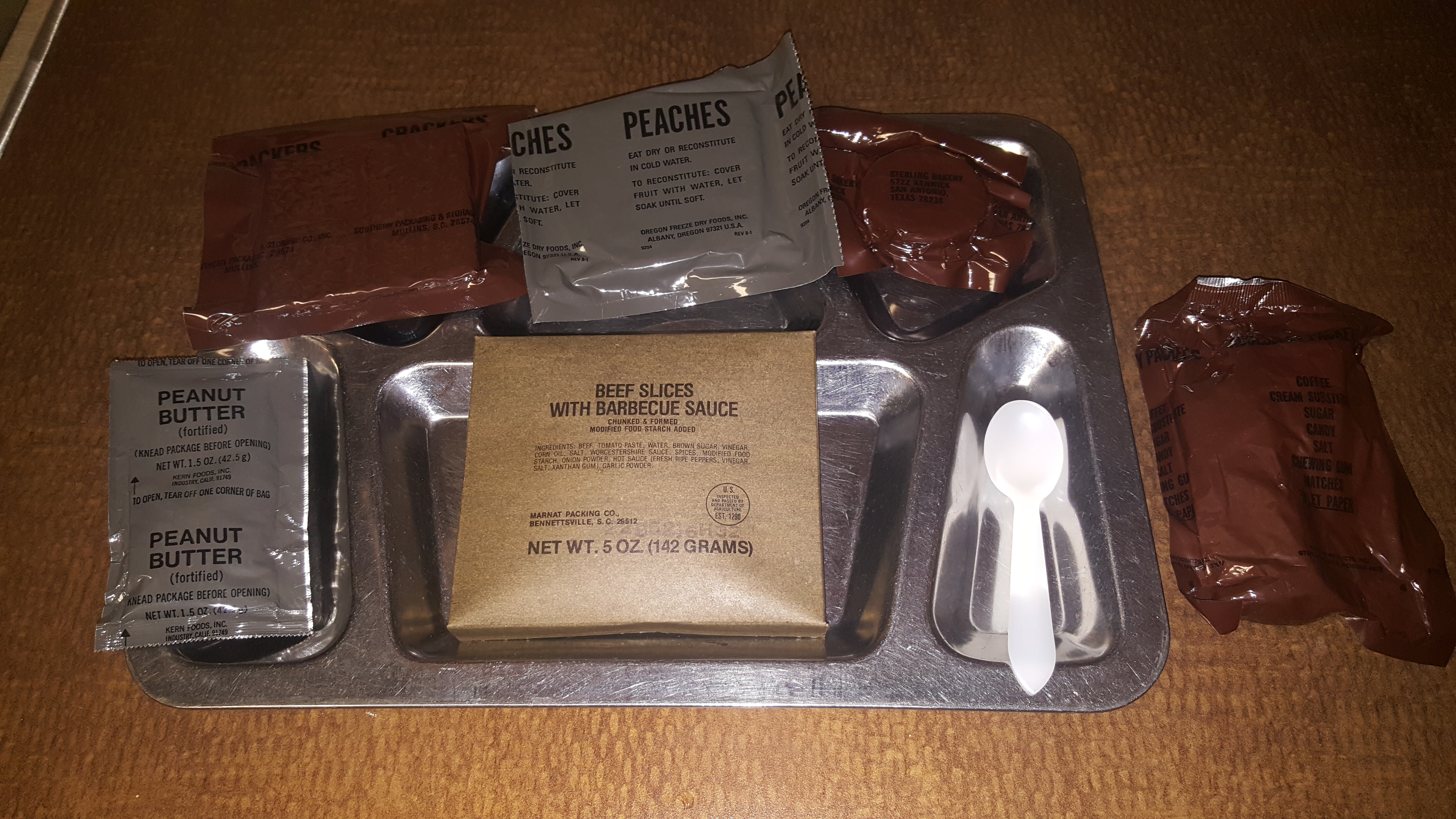 Here's a look at the items placed on the tray. This ration includes peanut butter, Beef Slices with Barbecue Sauce, crackers, freeze dried peaches, chocolate covered oatmeal cookie, and the accessory packet. If you look closely at the accessory packet, they underlined "Toilet Paper". I wonder why this is. You may also be able to tell that the cardboard sleeve containing the beef slices retort pouch is expanded more than the previous menus. I don't know if this is normal or a sign of age.