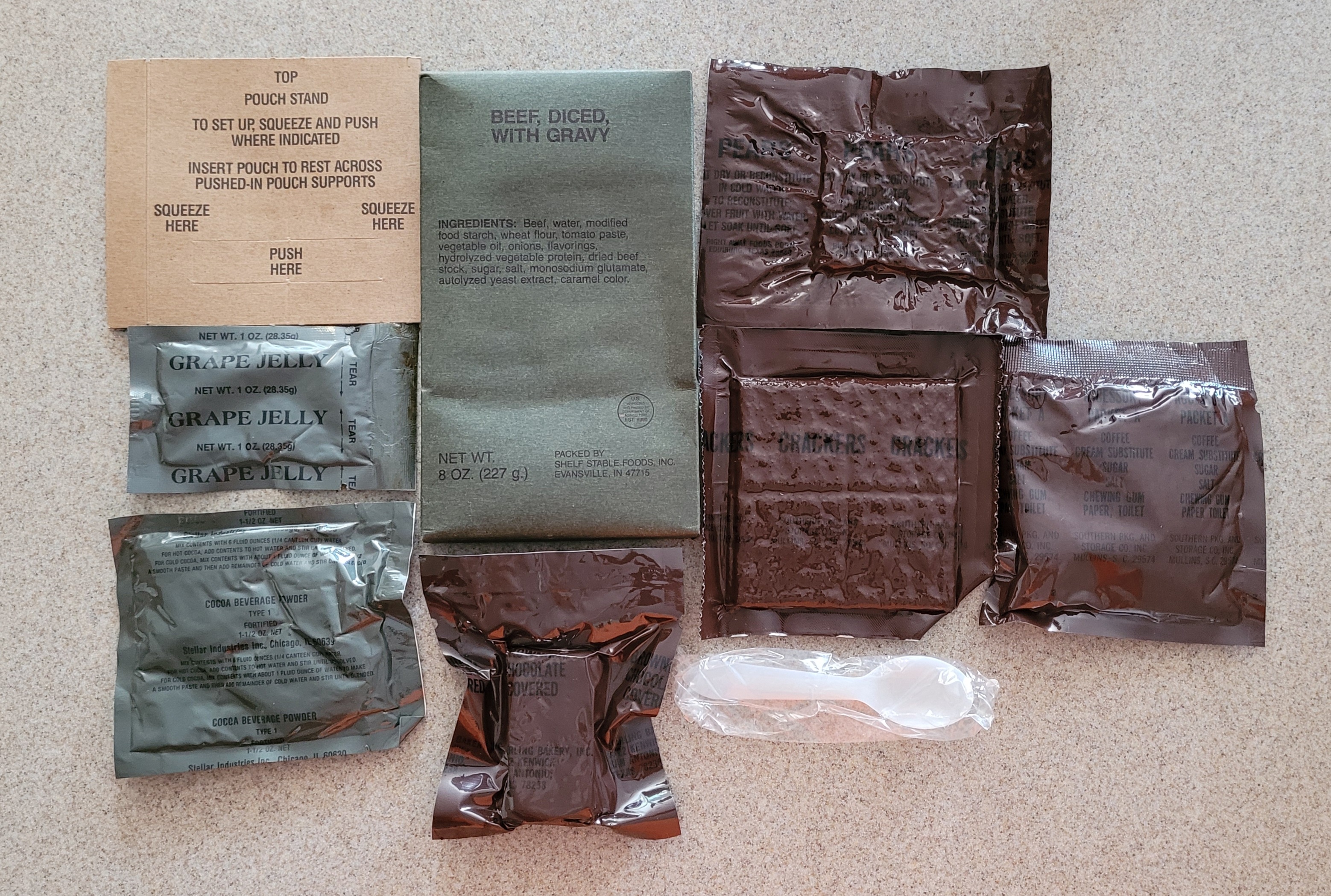 The only thing not edible from this meal was the brownie. It had the rancid nut and sorbitol flavor. I gotta get one soon that’s good, right? Everything else was as good as you can get. I mixed the coffee and creamer with the cocoa beverage powder it really hit the spot. Not a big fan of Jelly, but I tried it. It was sweet with just a hint of grape. Beef and gravy was absolutely perfect. Good flavor and beef had a nice chew, not just mush. Crackers and freeze dried pears were great, of course.