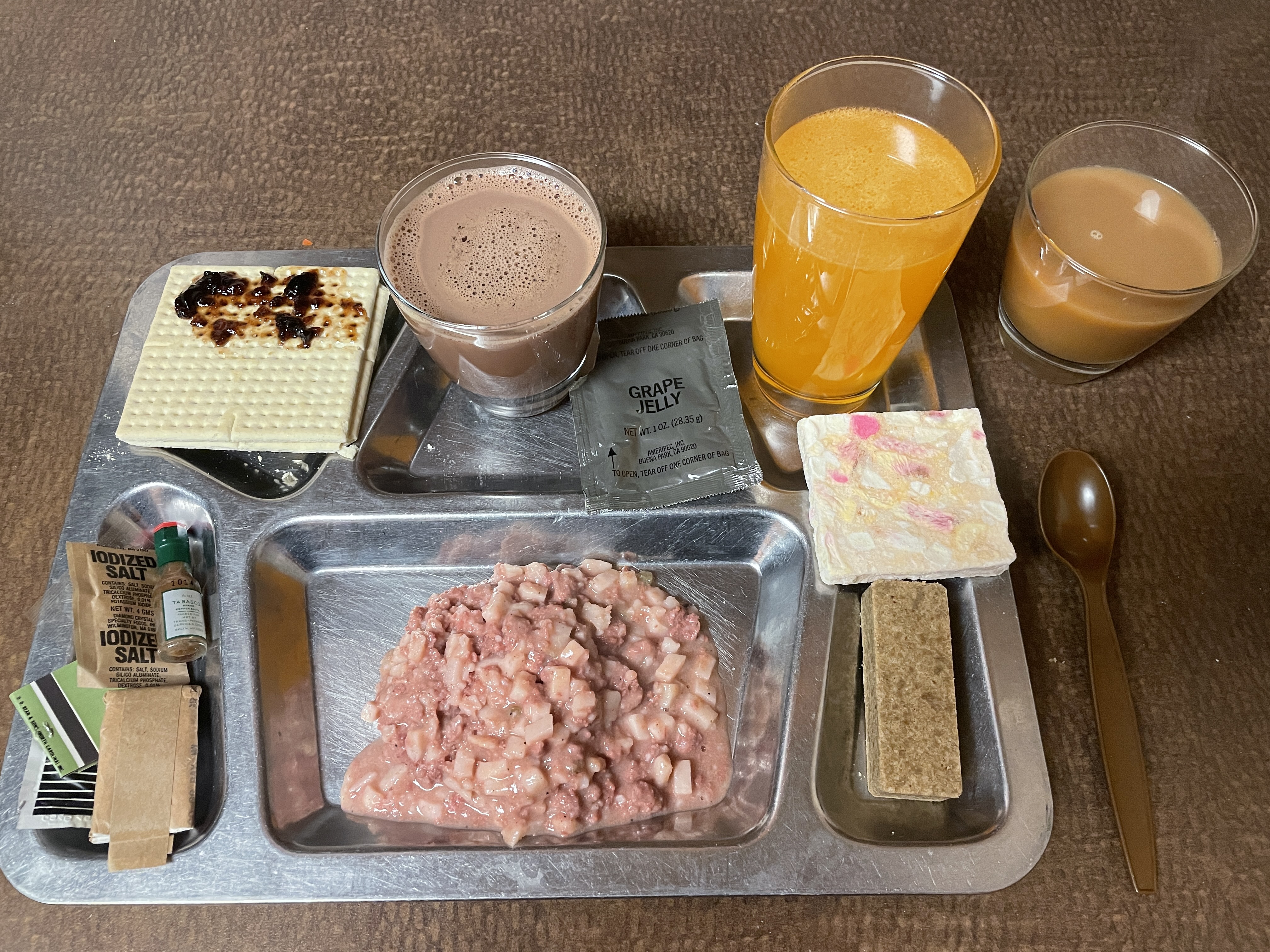 The orange mix tasted like a sweeter version of Tang, it was pretty tasty although I'd rather gave orange gatorade. The cocoa mix was perfectly creamy, sweet and chocolatey. The crackers were okay, but I wish they were more toasty like they were in the 1980s MREs. The grape jelly was still edible but tasted a bit fermented and not fresh at all.