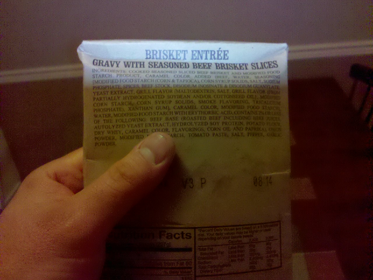 My son and I tried the beef brisket today. It was delicious, but it should be labeled roast beef in gravy, not beef brisket. The meat was real slices of meat, not chopped and formed. The gravy is very good. I guess my only problem with this entree is when you hear beef brisket, you think BBQ. Or at least I do. We are in the process of relocating to a new area. The company I work for is opening a new store in Kentucky and I will be moving soon. I will post more reviews when I can. I have a basement full of new cases ready to tried.[/attachment]