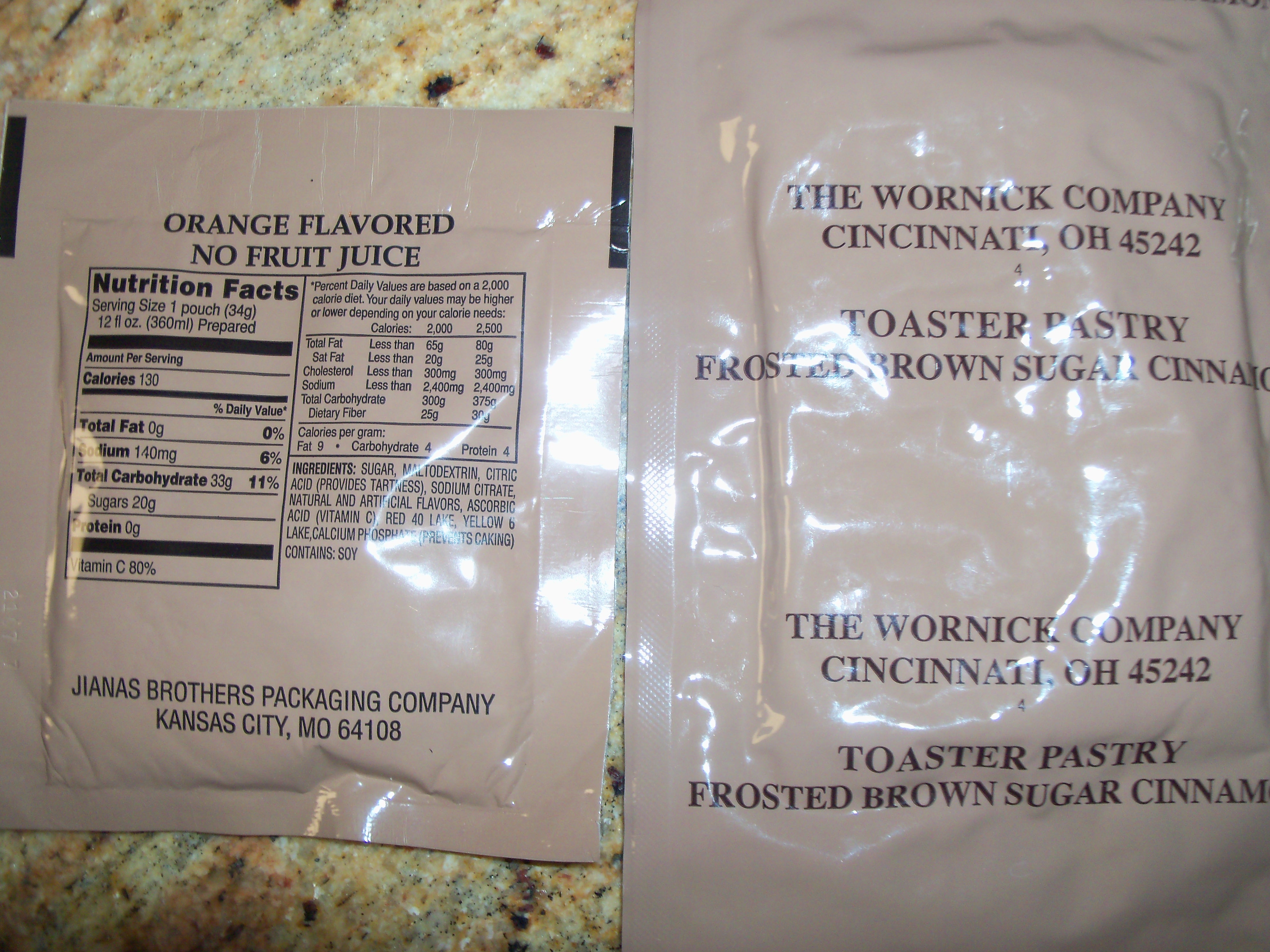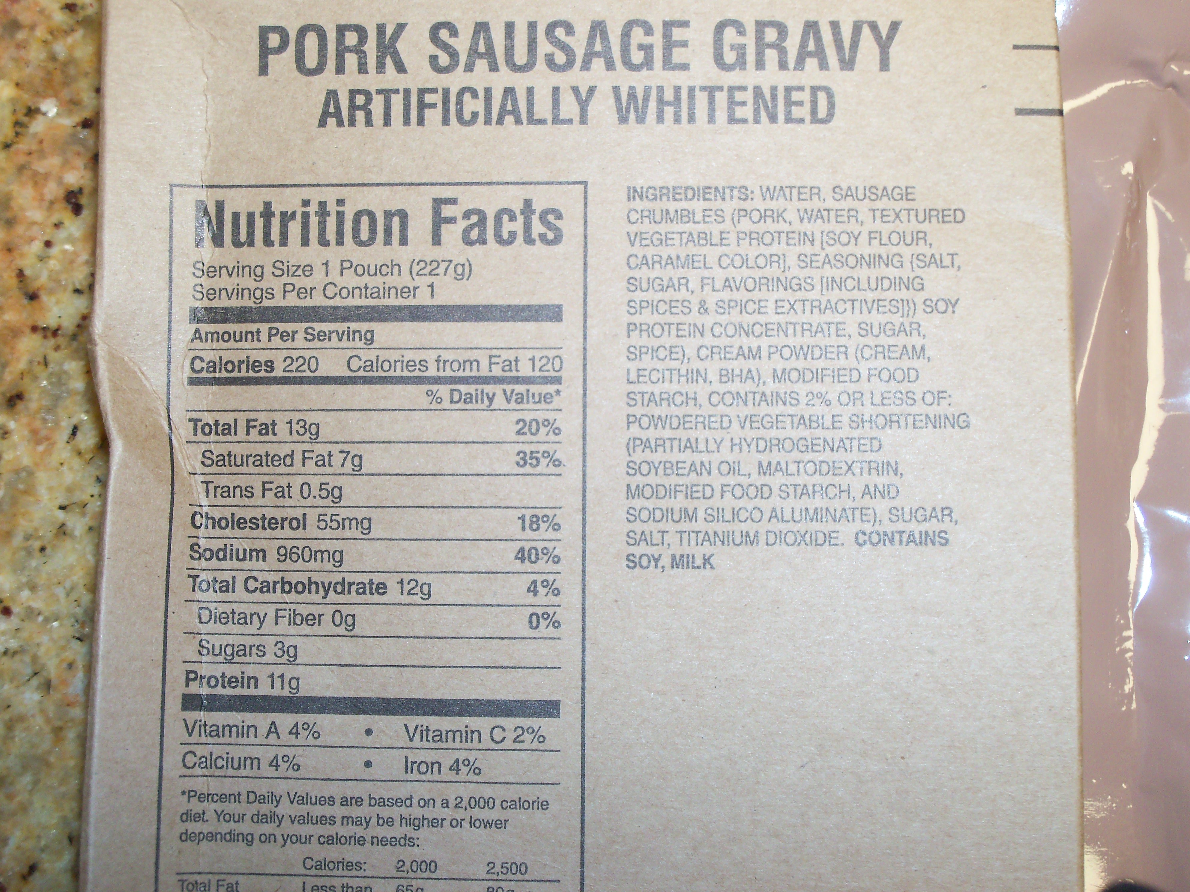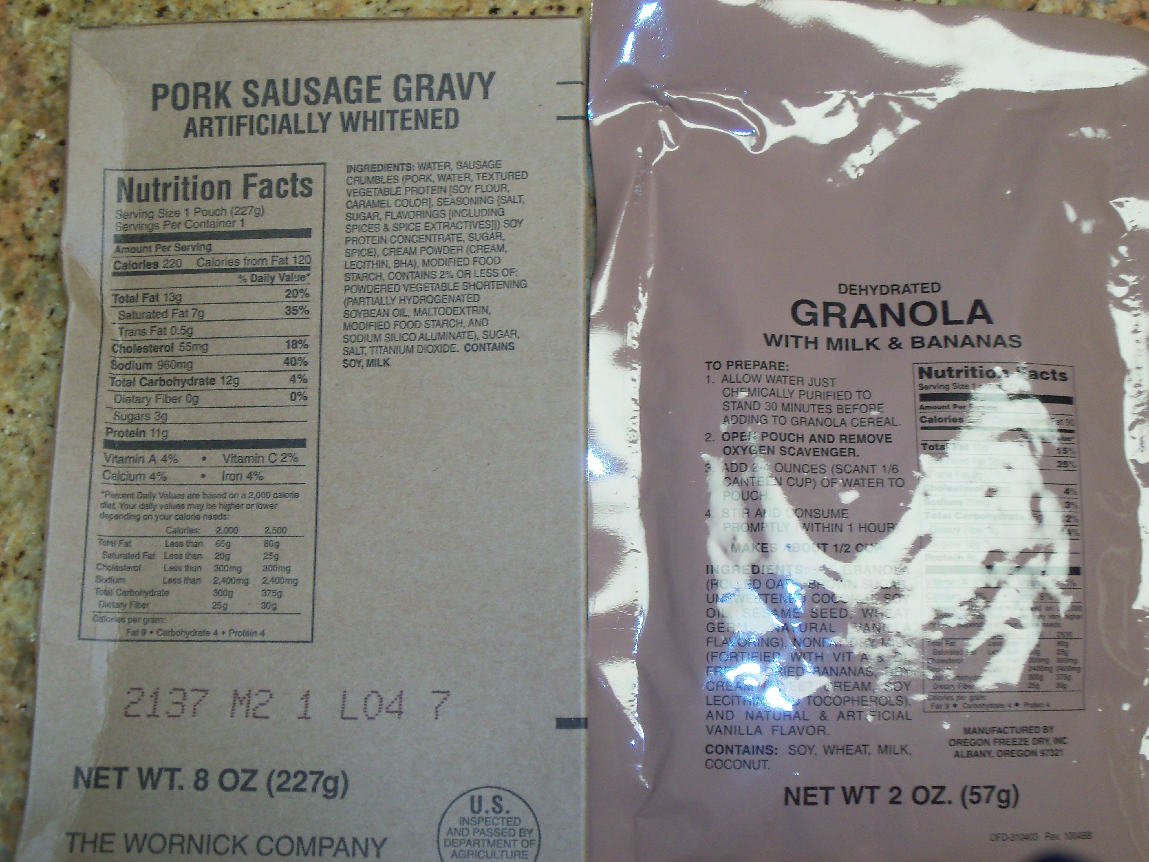 Now that I ponder it, a breakfast MRE that I'd like to see would be the military classic, SOS. Chipped corned beef in cream gravy, on toast. known as "Chit on a Chingle". I enjoyed it a lot when I was a youngster (I was born in the late Holocene Epoch) and haven't actually thought of it in years. It was not at all the same as sausage and gravy.