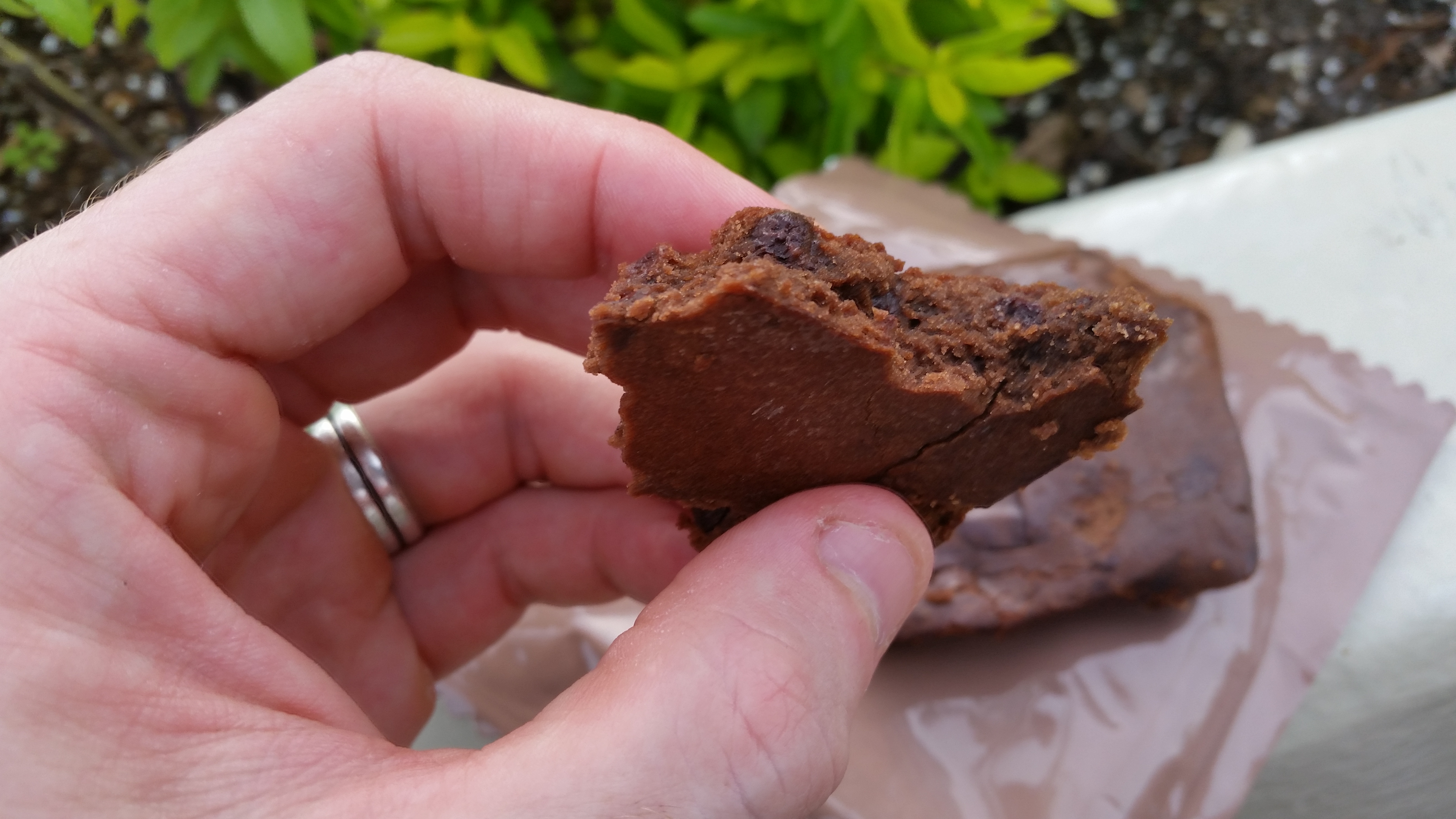 It's more moist than old school mre brownies. Same flavor, different consistancy. The texture is moist, spongy, and the flavor is up to par on my standards, but Carol says it's not "fudgy" enough. So my thoughts for Sterling Foods? Add more cocoa!