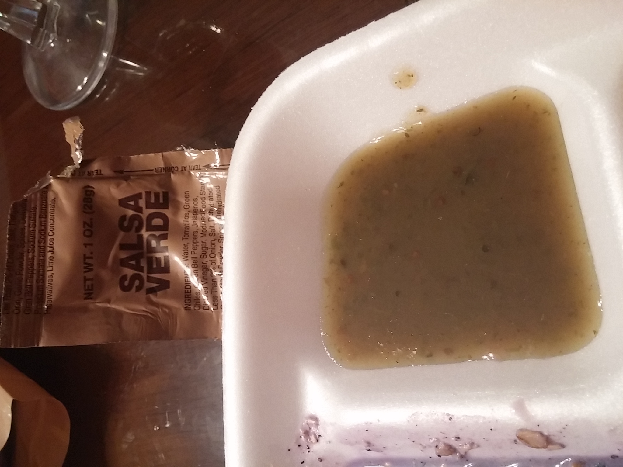 The trick with this meal - if anyone gets another one - is to vigorously and completely chop up the main until it actually looks like scrambled eggs. That improves the appearance and texture. Hot sauce or ketchup adds a lot. The salsa verde is indeed horrible, however.