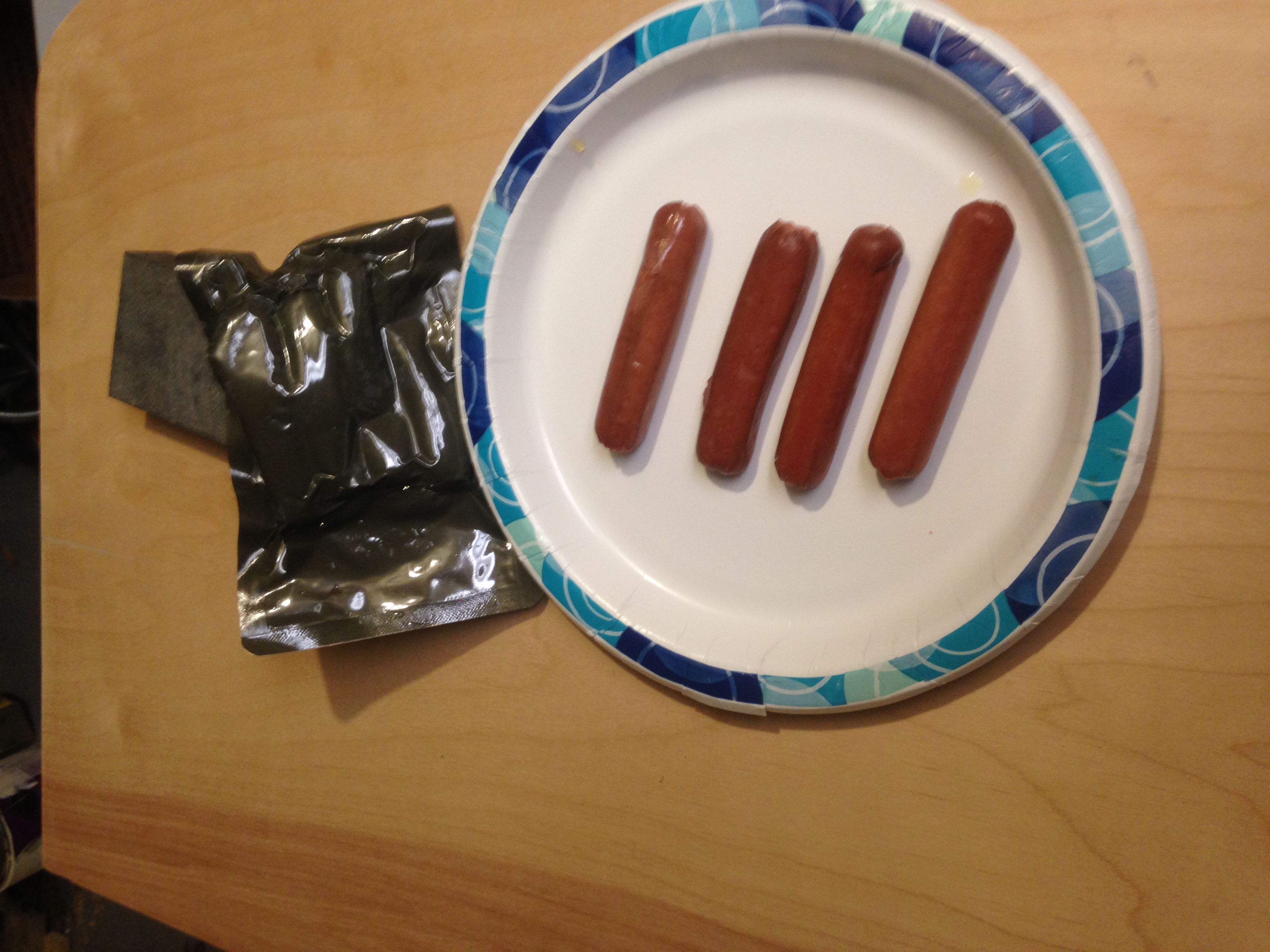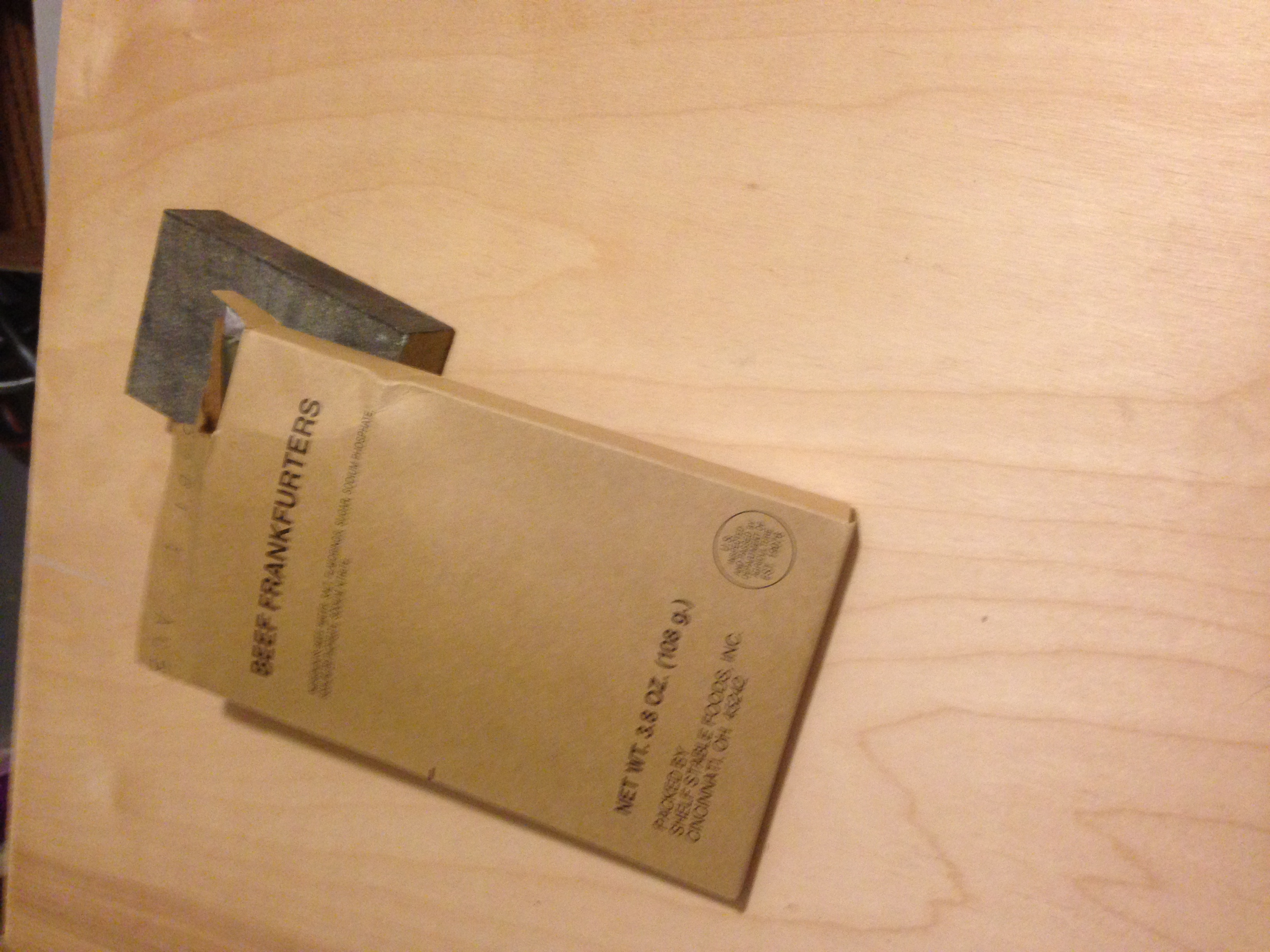 Then I moved on to the "Four Fingers of Death". The FRH worked better than I had expected, as I didn't really expect it to get warm at all. I could see that the powder had leaked out, as others have posted. It took about 10 minutes to really get warm, and it never got REALLY hot, but it was hot enough to warm the beef franks. My "or something" was a sanding block.
