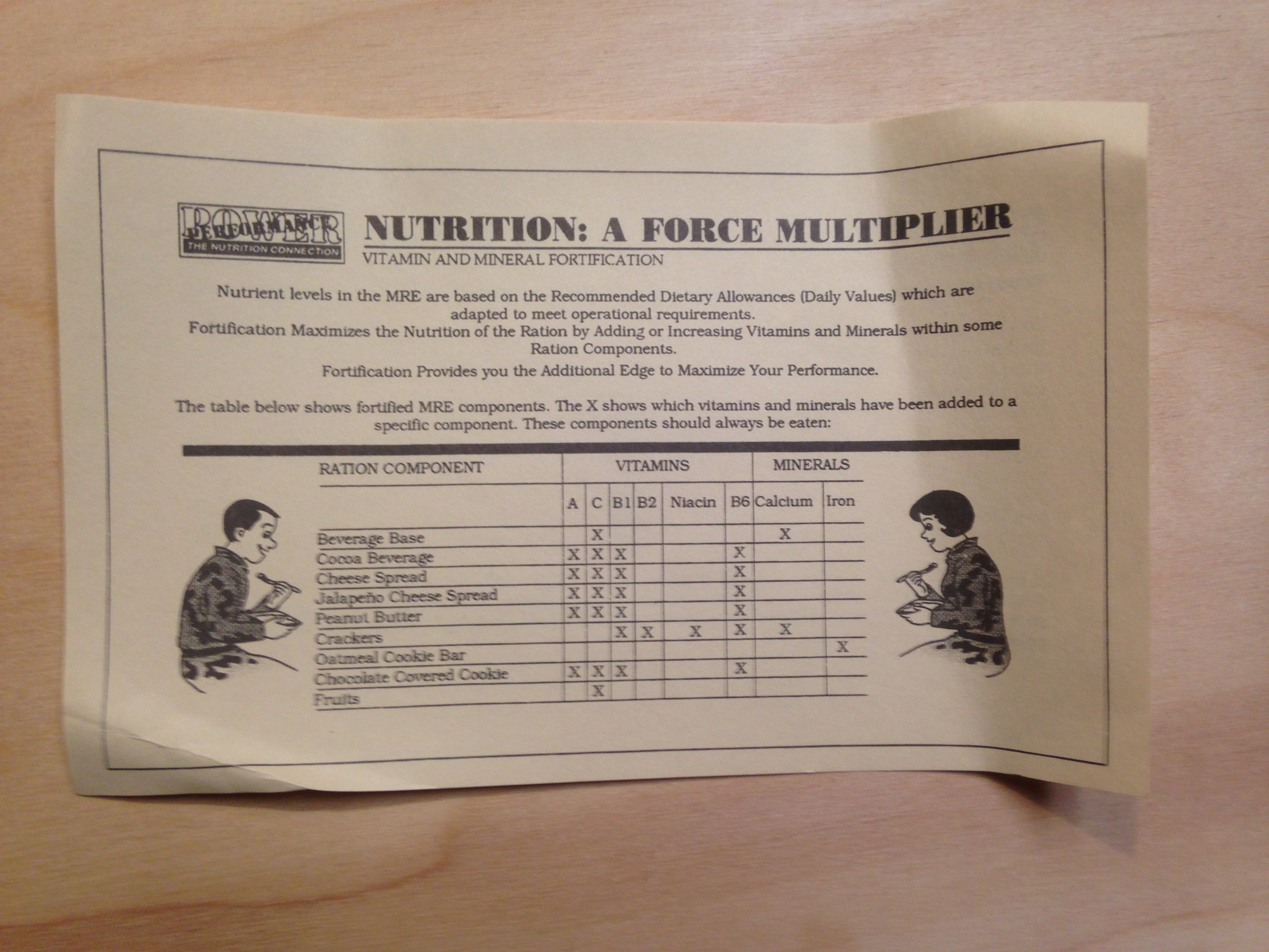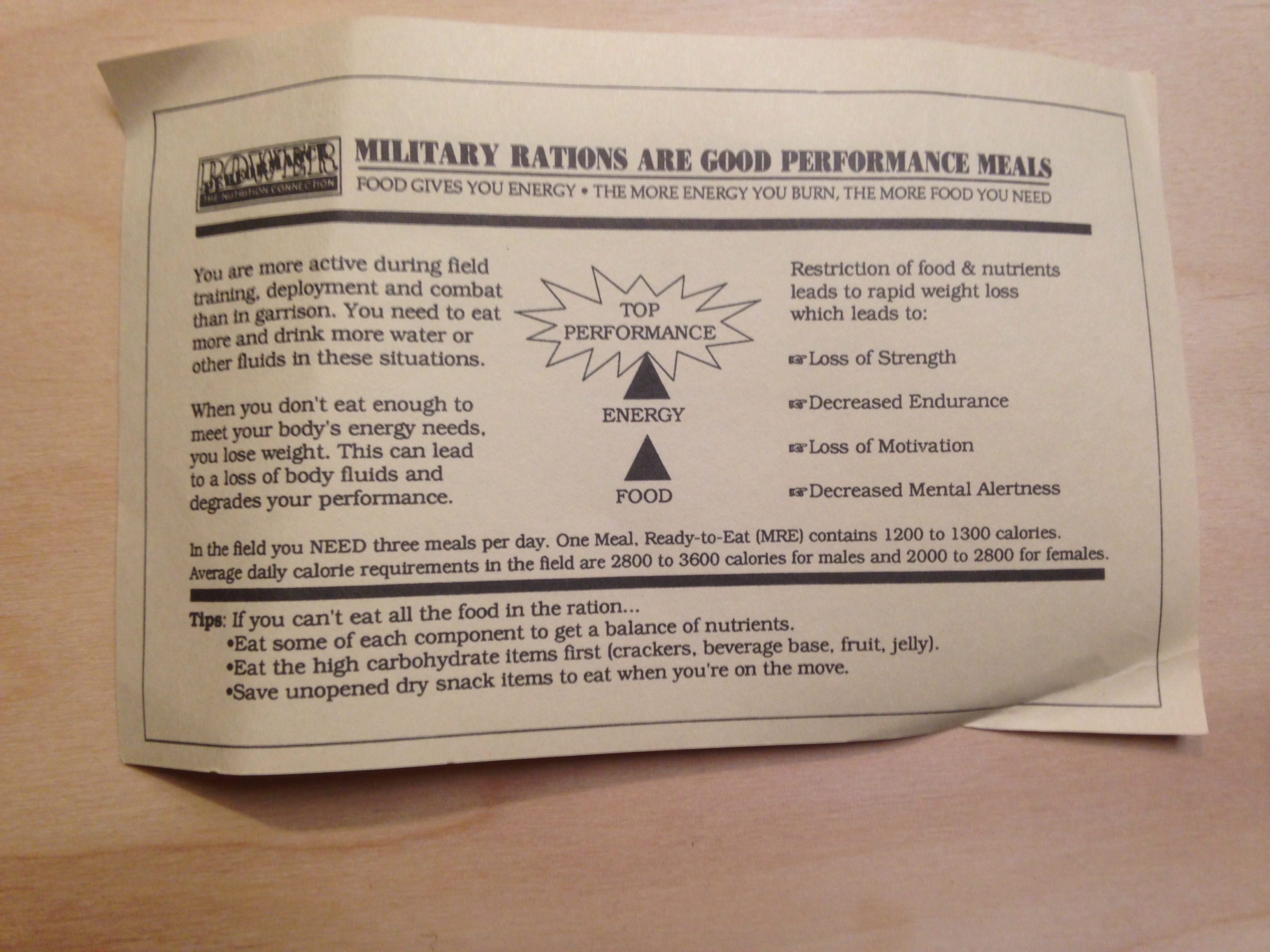 One interesting item in the bag was a flyer or note giving that seemed to be included to convince the consumer of the benefits of MREs and how best to use them. Have any of you folks seen these before?