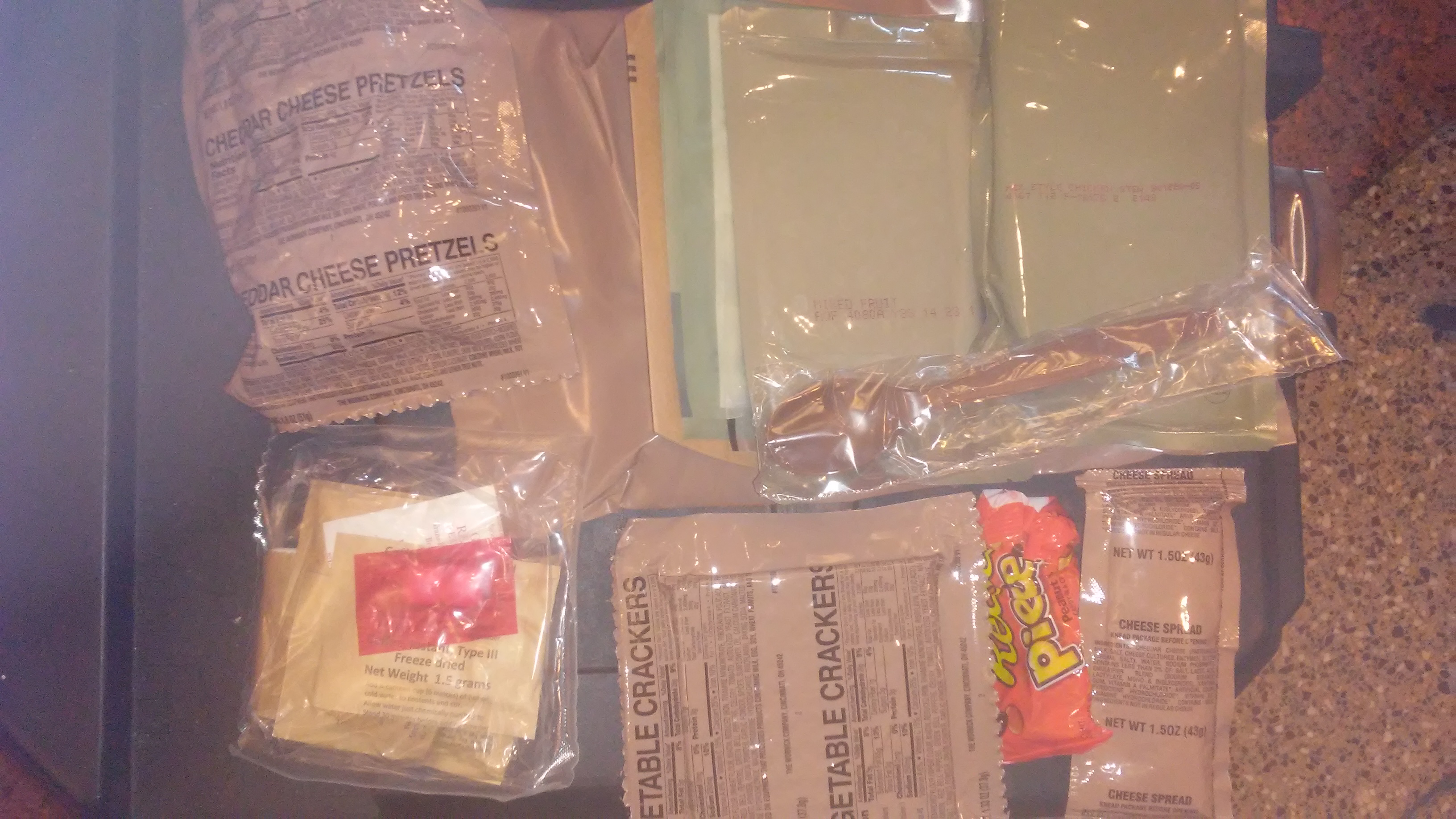 I forgot to take a pic of the cheese and crackers, but crackers were crisp and whole, still airtight, cheese spread was still solid, no separation. Good to go.