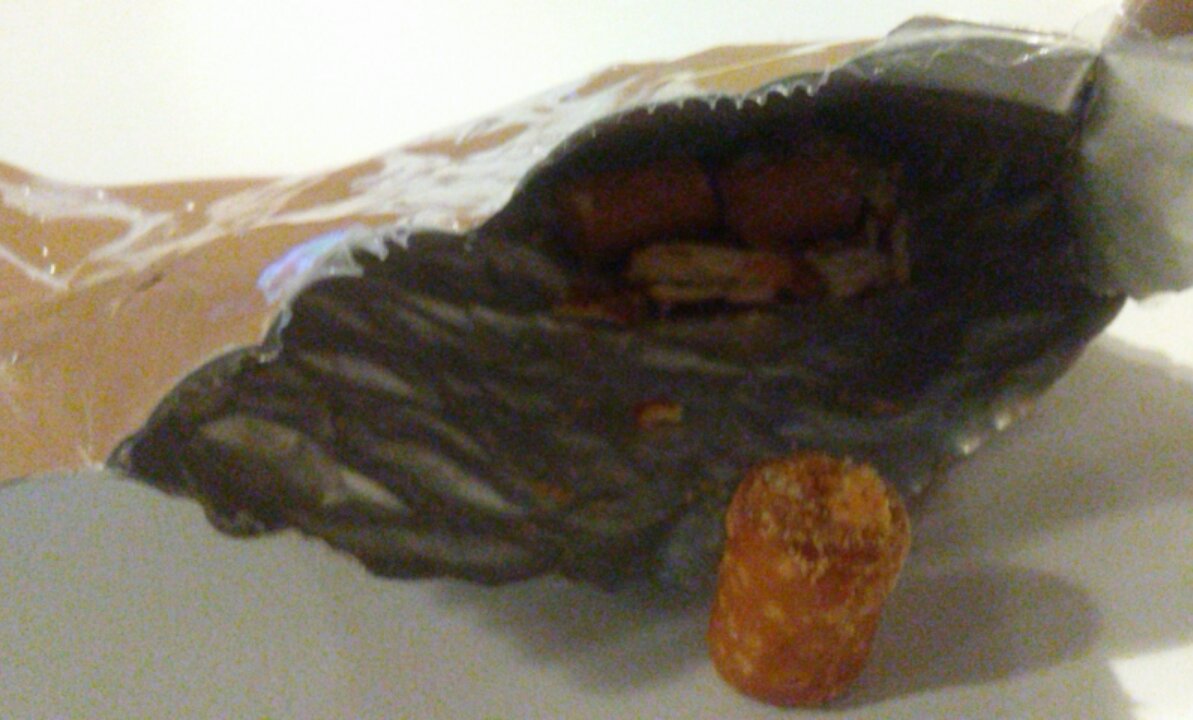 Cheddar cheese pretzels, Brand name Combos, was in good shape, some broken pieces in the bottom but still in good shape.