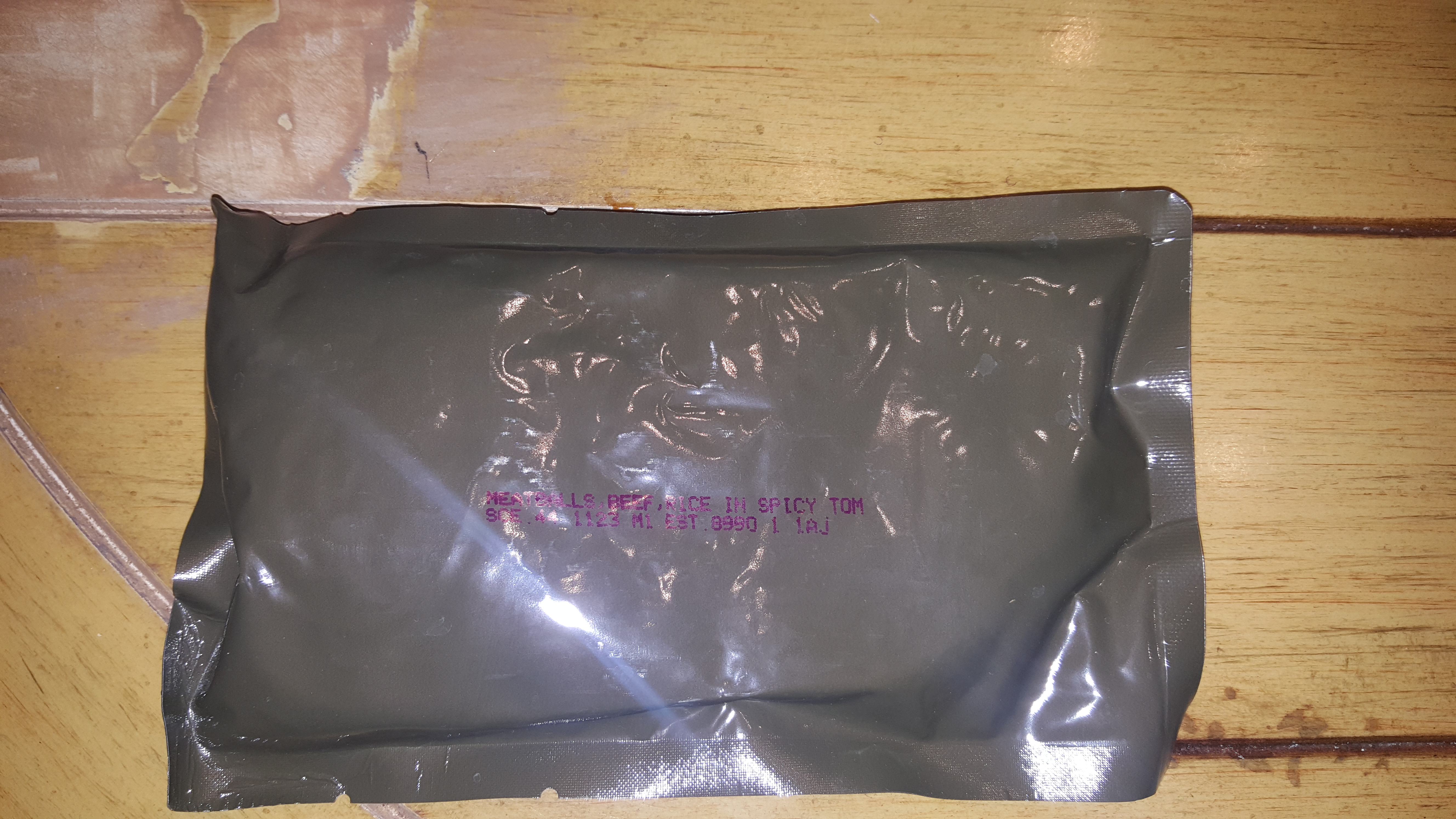 Here's a look at the entree retort pouch: Coffee, with sugar and creamer added prior to pouring water: The MRE fully prepared: Looks good! The crackers were pretty broken up when I removed them from the packaging. They still tasted alright, but unfortunately this MRE was produced shortly after they phased out the "really good crackers" from the 80s MREs. The peanut butter was also very tasty and I couldn't tell the difference between it and some produced yesterday. The freeze dried fruit and chocolate covered cookie are always welcomed additions to any MRE. I think we can all agree that they should be brought back to modern MREs. The Tootsie Rolls weren't fresh, you could definitely tell that they had some age on them. They weren't as sweet and the chocolate flavor wasn't very pronounced, but they tasted alright regardless. I was nearly stunned and how good the meatballs in tomato sauce tasted. It was smoky with a mild taste of molasses and brown sugar. The fact that it was heated up also really brought it to life. I've had it cold and thought it was alright but I can't recommend heating it up prior to eating enough. There were also very small rice chunks in it, but they were barely noticeable and I don't think they really added much to it. This is another meal they could bring back, I'm sure it would be popular especially since it could be heated up with an FRH.