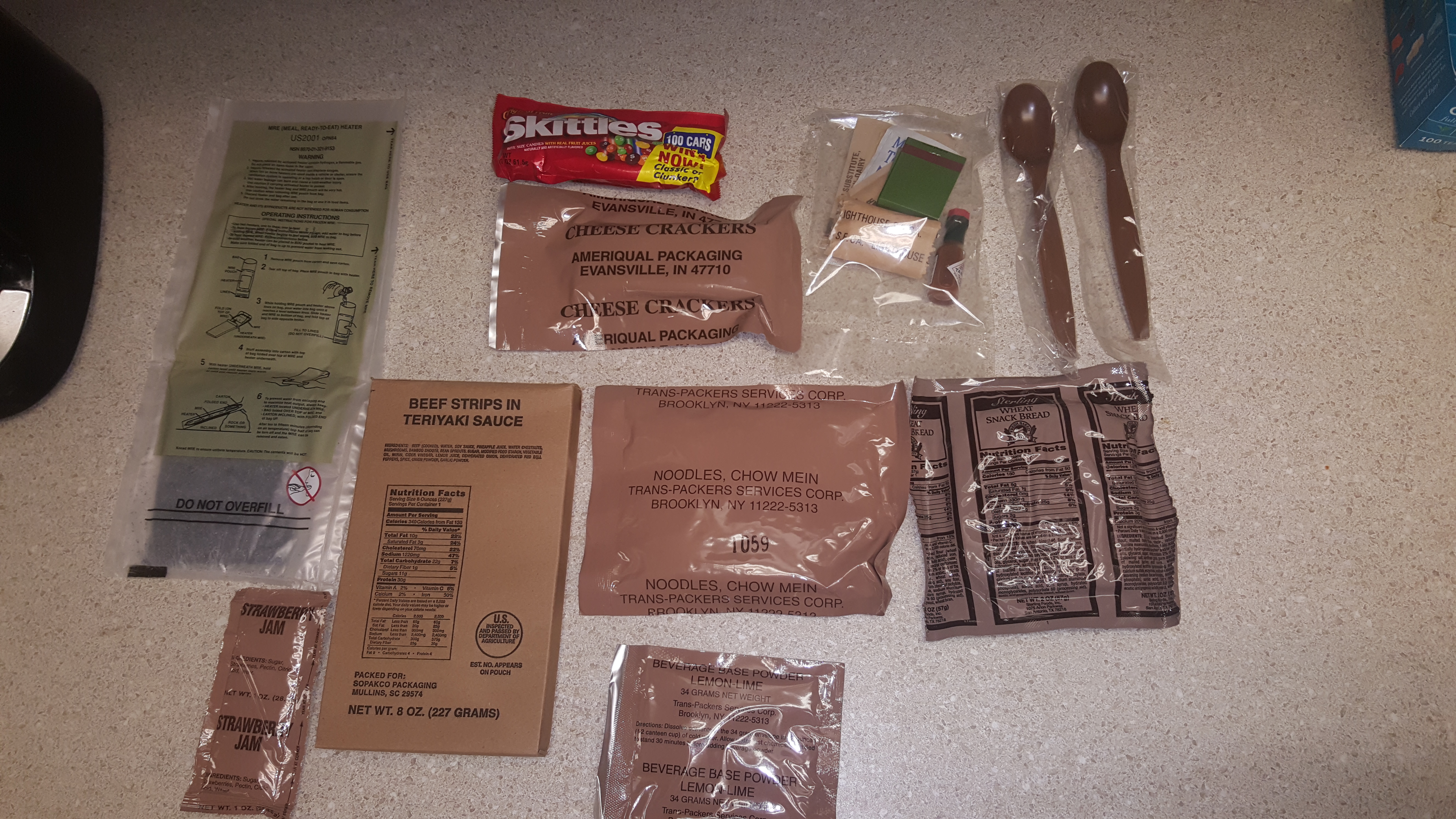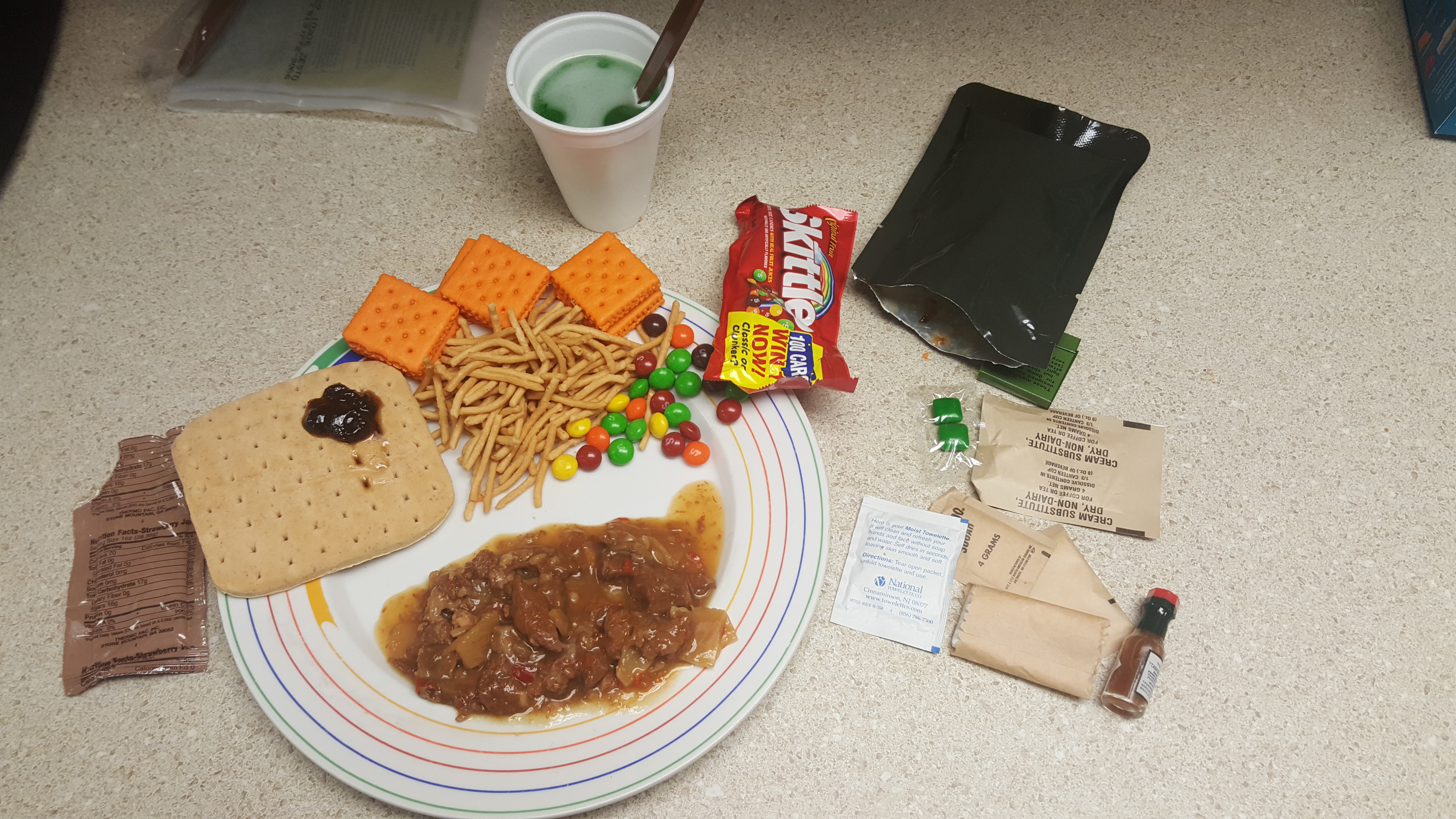 Looking good! I'll just start off by saying nothing went bad in this MRE except for the Taster's Choice, which is probably to the surprise of absolutely nobody. This meal had so much I could barely fit it on the plate. The beef teriyaki had a strong hint of soy sauce flavoring with a mild bit of sweetness to it, but not too much. The bamboo pieces made the experience pretty enjoyable and unique to see in an MRE of all things. The wheat snack bread tasted about the same as the current production, although I'm sure the ingredients listing has changed the amount of calories in it has remained the same. The strawberry jam was also sweet and tasty, not darkened or aged in any way. I've heard that the chow mein noodles go bad pretty quickly, however these held up nicely. I added some of them to the main and it added a nice crunchy texture to it. The cheese crackers were a little lacking on flavor but were still a nice addition, although I was hoping for the Combos instead. And the Skittles? Always a treat, especially in the older rations since they always hold up well and this one had flavors they no longer make.