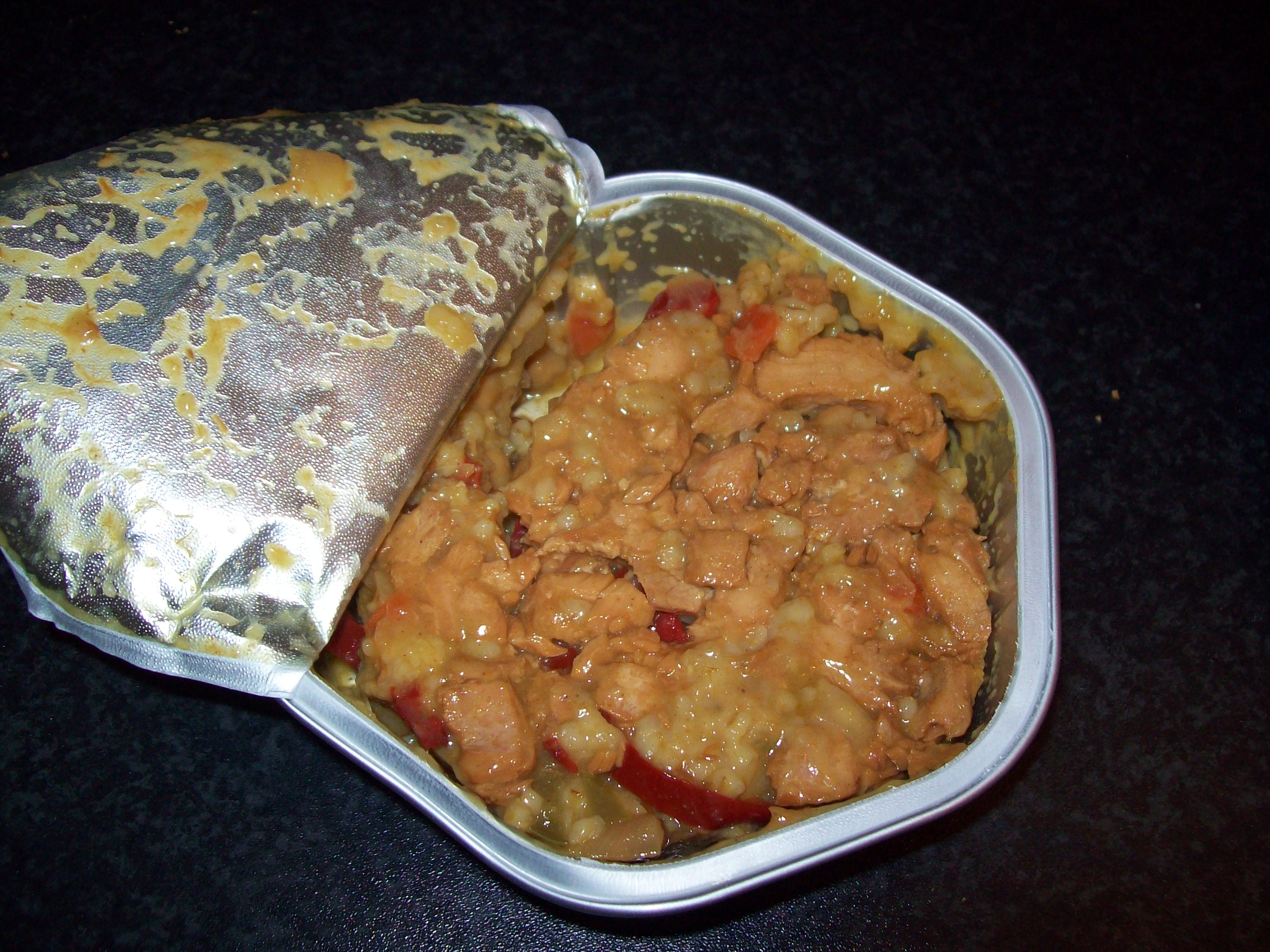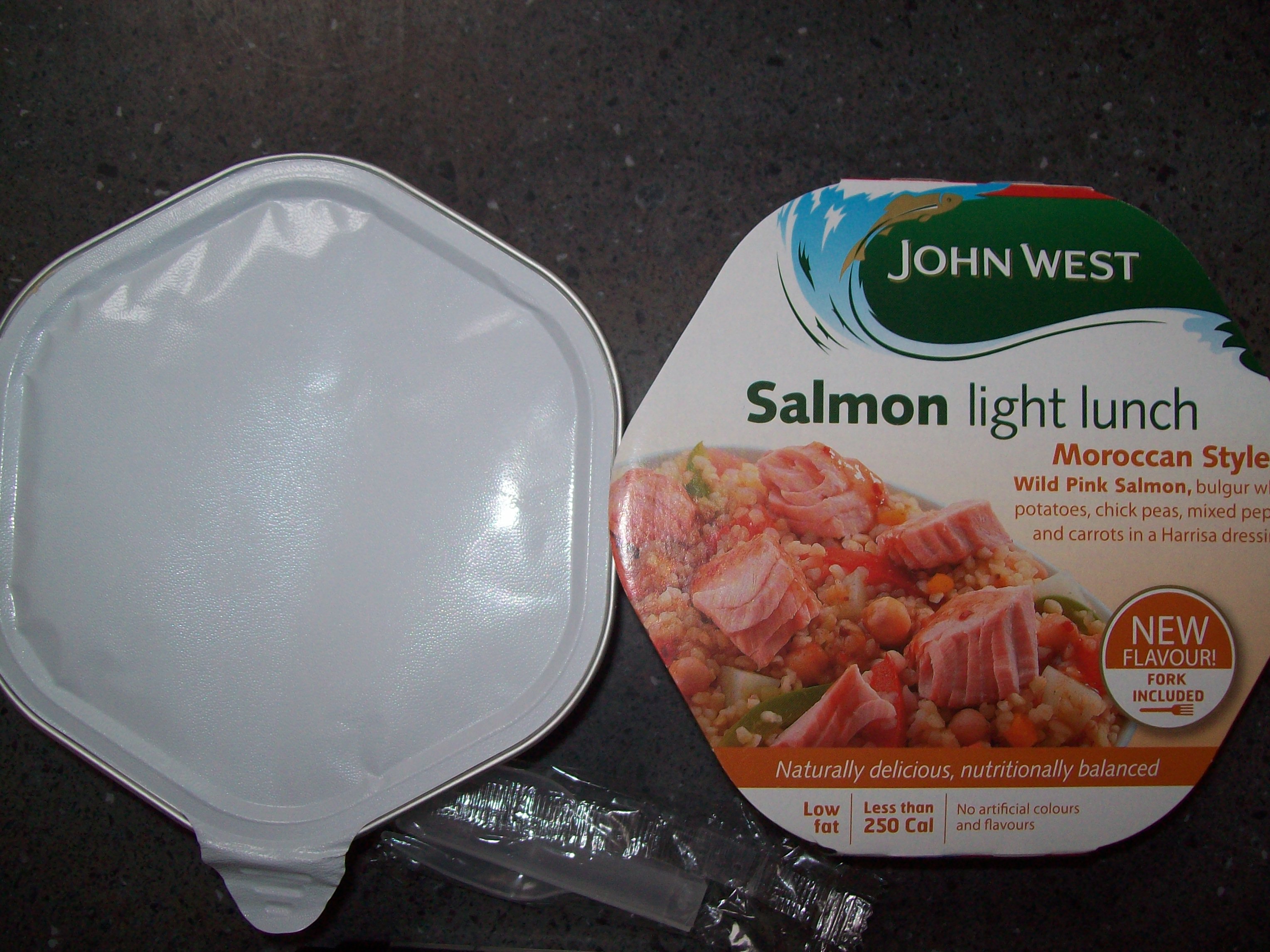I opted for the Morrocan Style wild pink Salmon, with bulgur wheat, potato, chick peas, peppers and carrots in harrisa dressing. Date on the base says it can be storred unti June 2012, so it should be in-date for the apocalypse!