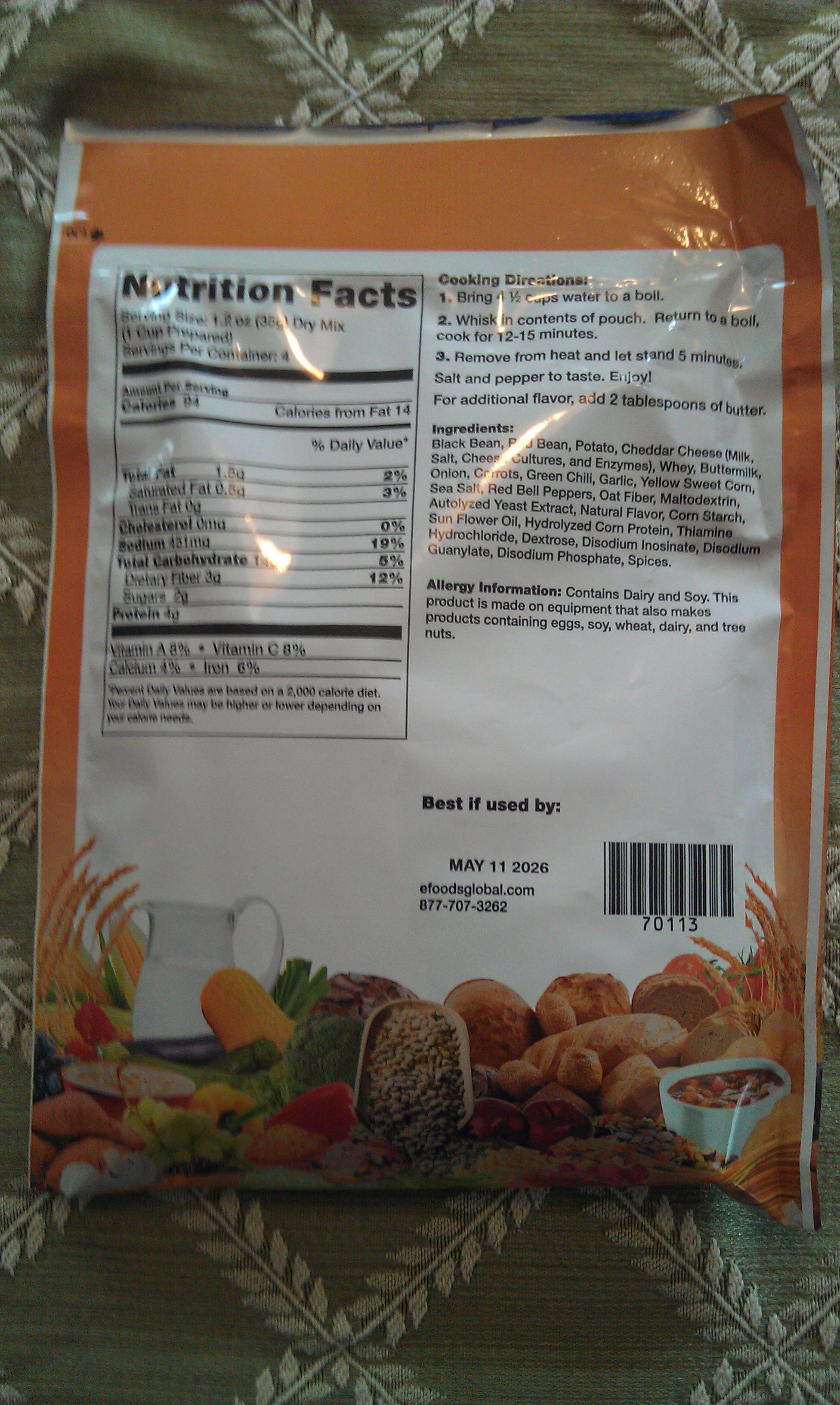 Front of Package Back of Package As you can see it has a best by date of 5/11/2026. Figure 15 years is not bad, but the website claims a shelf life of up to 20 years. It does require what I consider to be a large amount of water to reconstitute (Four and half cups). Cook time was about 13 mins, and I let it rest for 5 mins per the instructions.