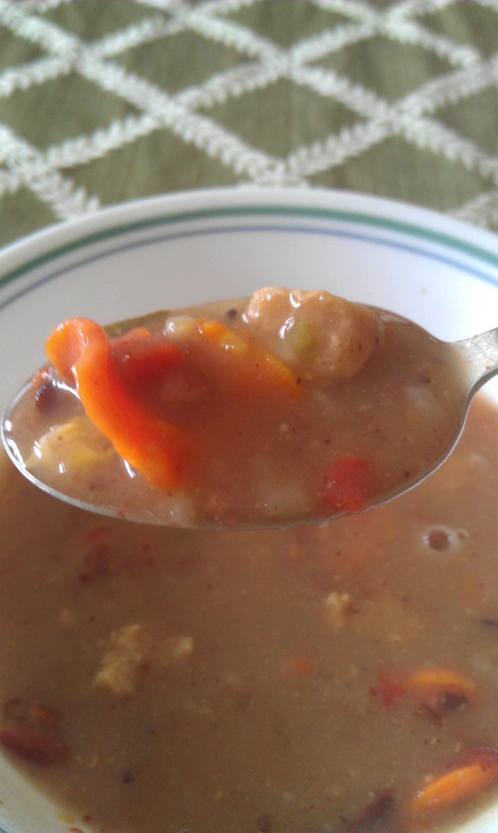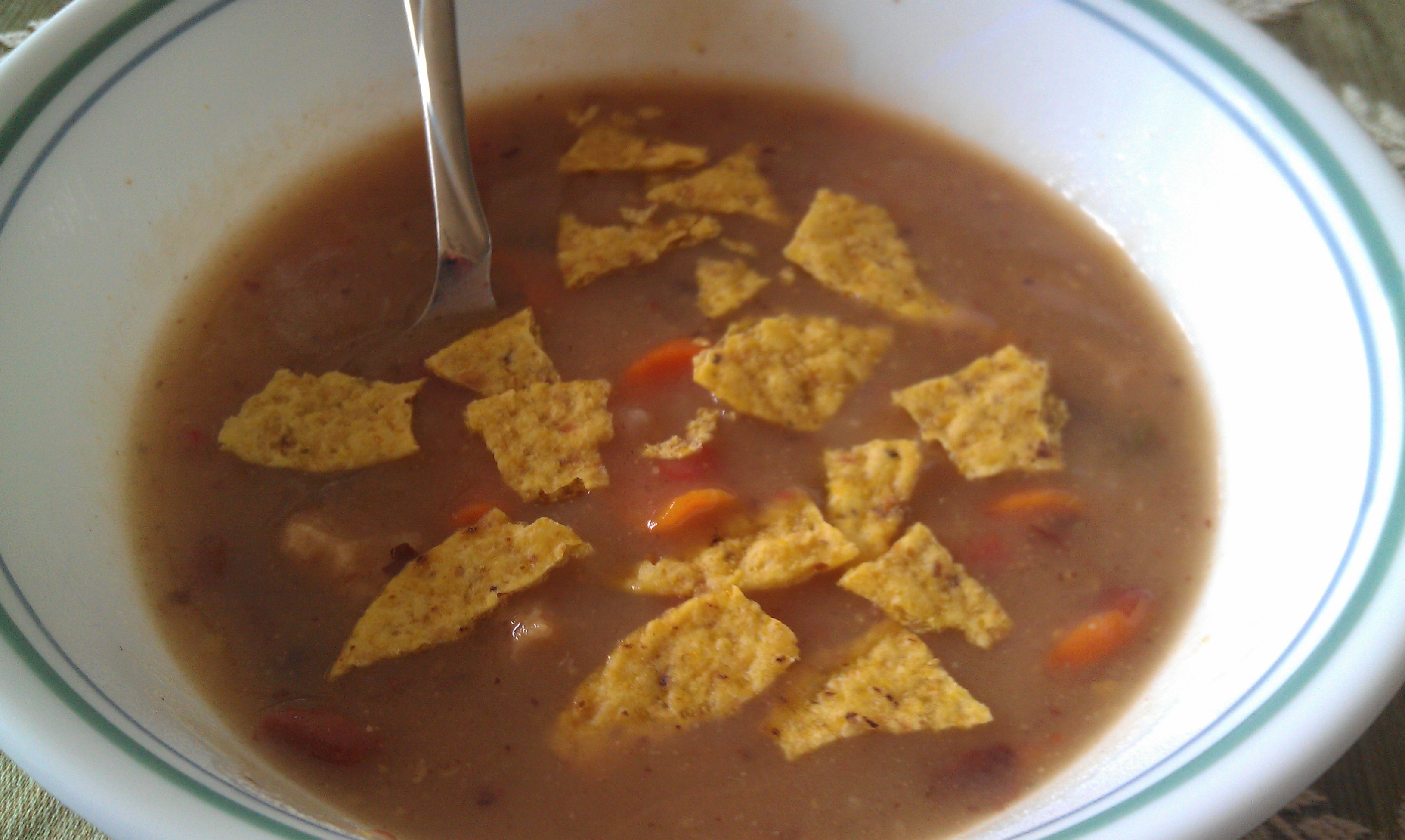 First spoonful Here is the first bite. It had a nice assortment of red and brown beans, decent size chicken chunks, and big plump slices of carrots. The carrots tended to be just the slightest bit chewy, but the rest was quite tender. I had the salt and pepper on standby, but they were not needed. It had a very pleasant taste, texture, and level of flavorful spice. It was quite reminiscent of Applebee's Tortilla Soup. It was missing something though. After adding some crumbled tortilla chips I had laying around, it was the perfect Tortilla Soup! It just need that bit of crunch offered by the chips.