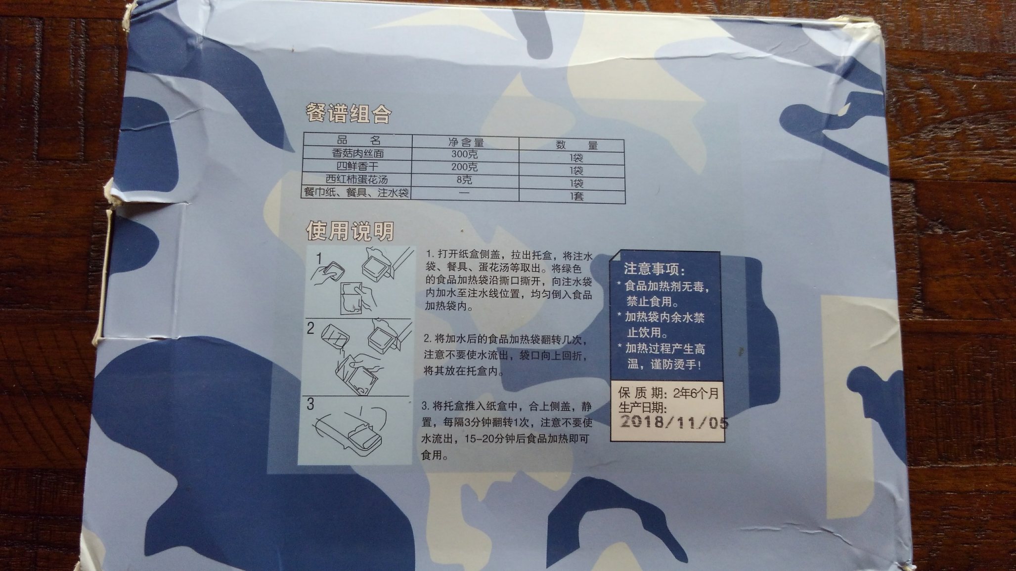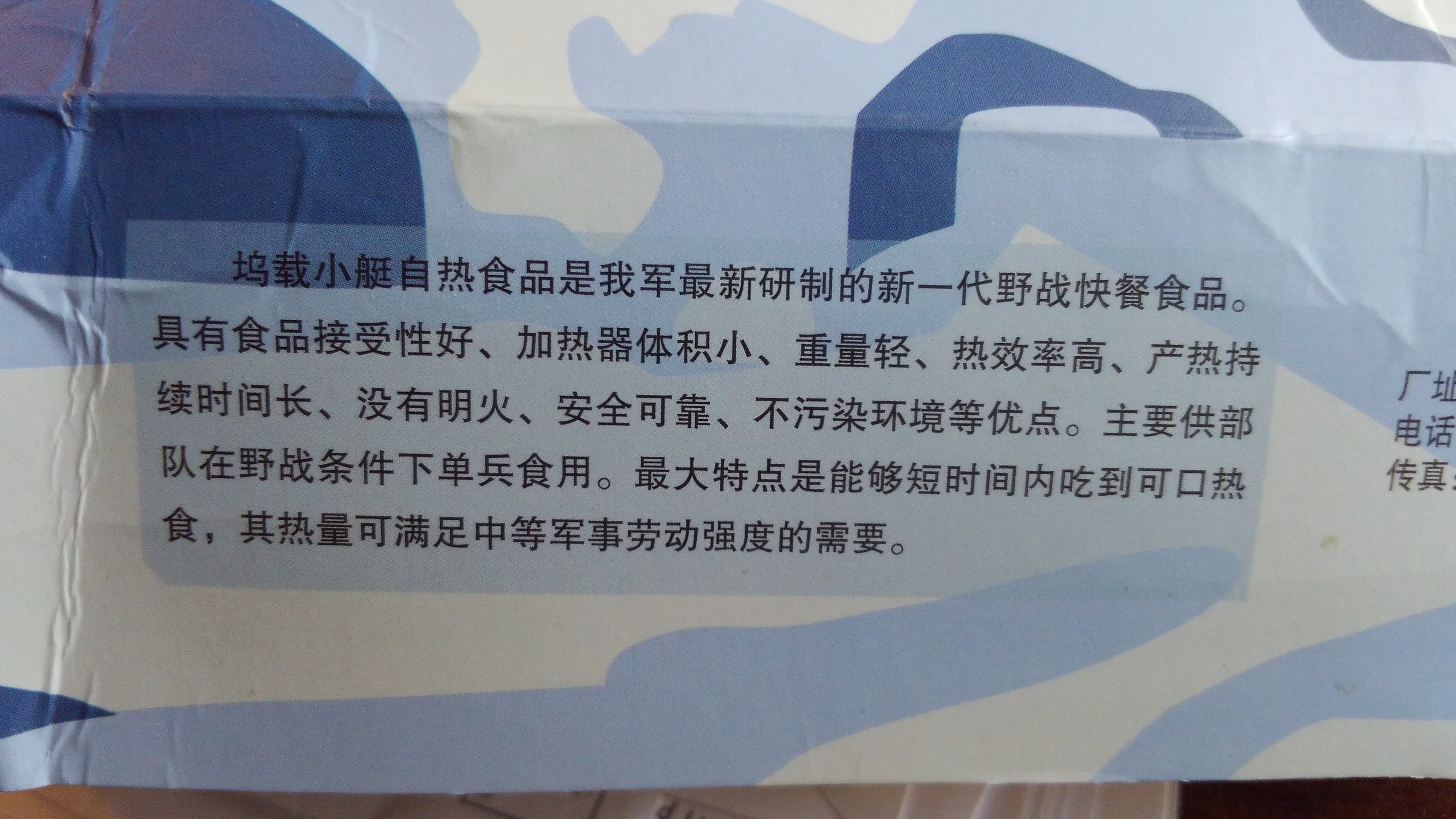 "Navy self-heating food is the latest generation of field fast food developed by our army. It has the advantages of good food acceptance, small heater size, light weight, high thermal efficiency, long heat generation duration, no open flame, safe and reliable, and no pollution to the environment. It is mainly for the individual soldiers to eat under field conditions. The biggest feature is that it can eat delicious hot food in a short time, and it's calories can meet the needs of moderate military labor intensity."
