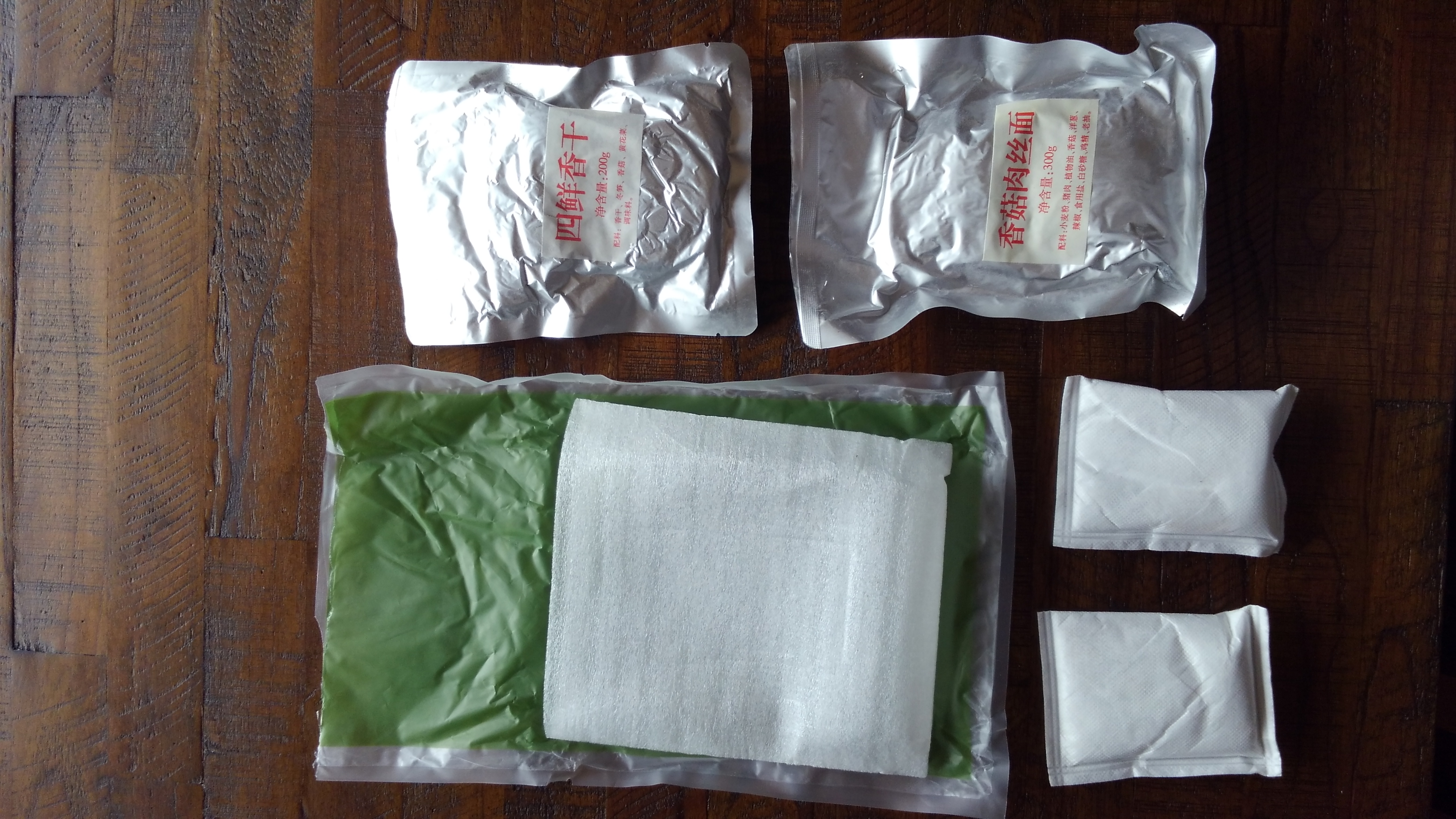 The FRH that comes with this ration, like all of the Chinese FRH's I have seen so far, is an absolute powerhouse. The two heat packs had no problem bringing two large mains to a temp that was almost too hot to eat. After 20 minutes of activity, water was still bubbling in the inflated bag.