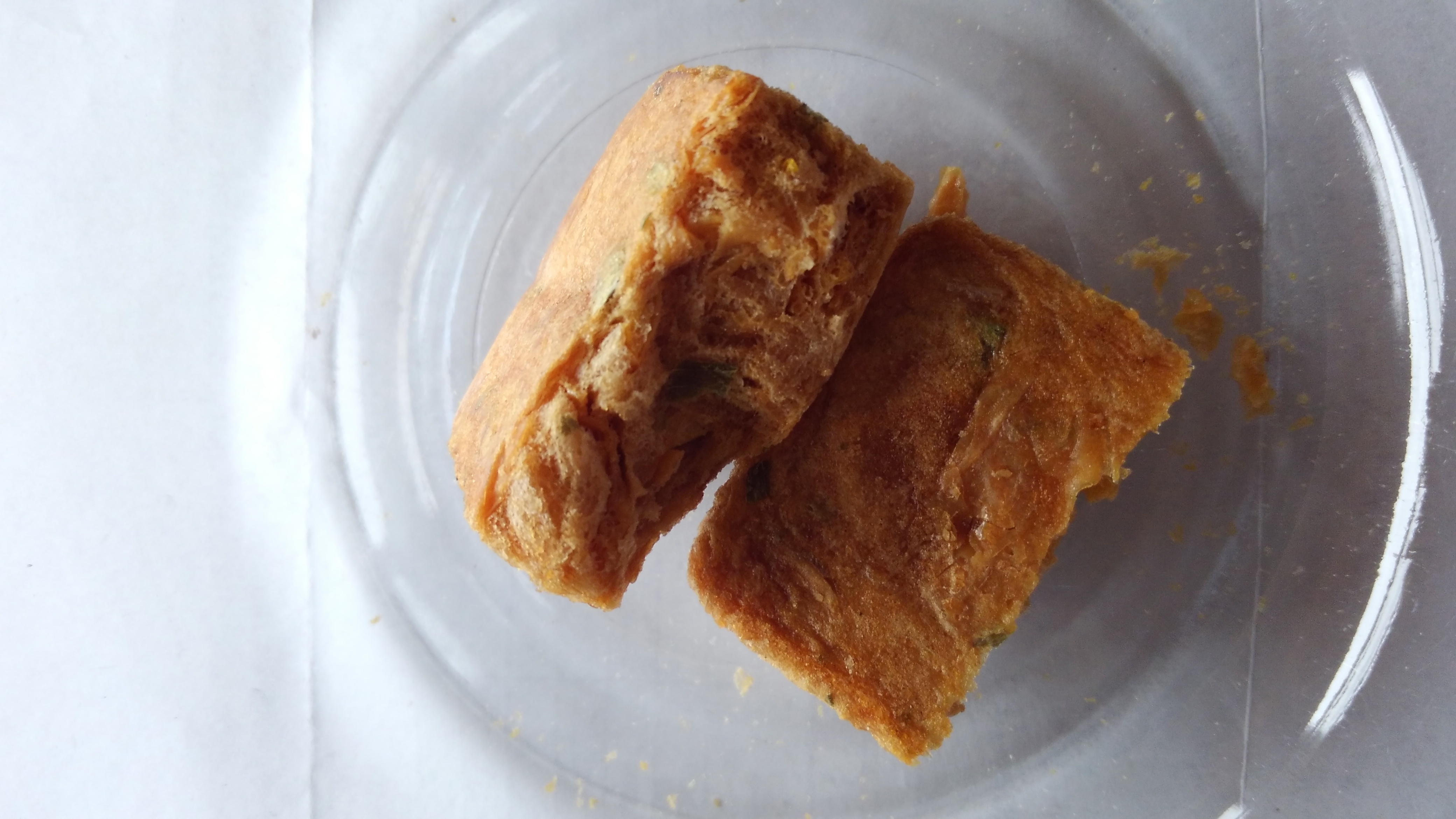 It's listed as "egg soup". In cube form it was very styrofoam-esque, with bits of green onion, some clearly discernible egg bits, and a faint orange tint that hinted of the possibility of tomatoes or heat. The dry cube had a faint vegetable/cardboard smell. A small taste was very dry, very salty, and slightly sour.