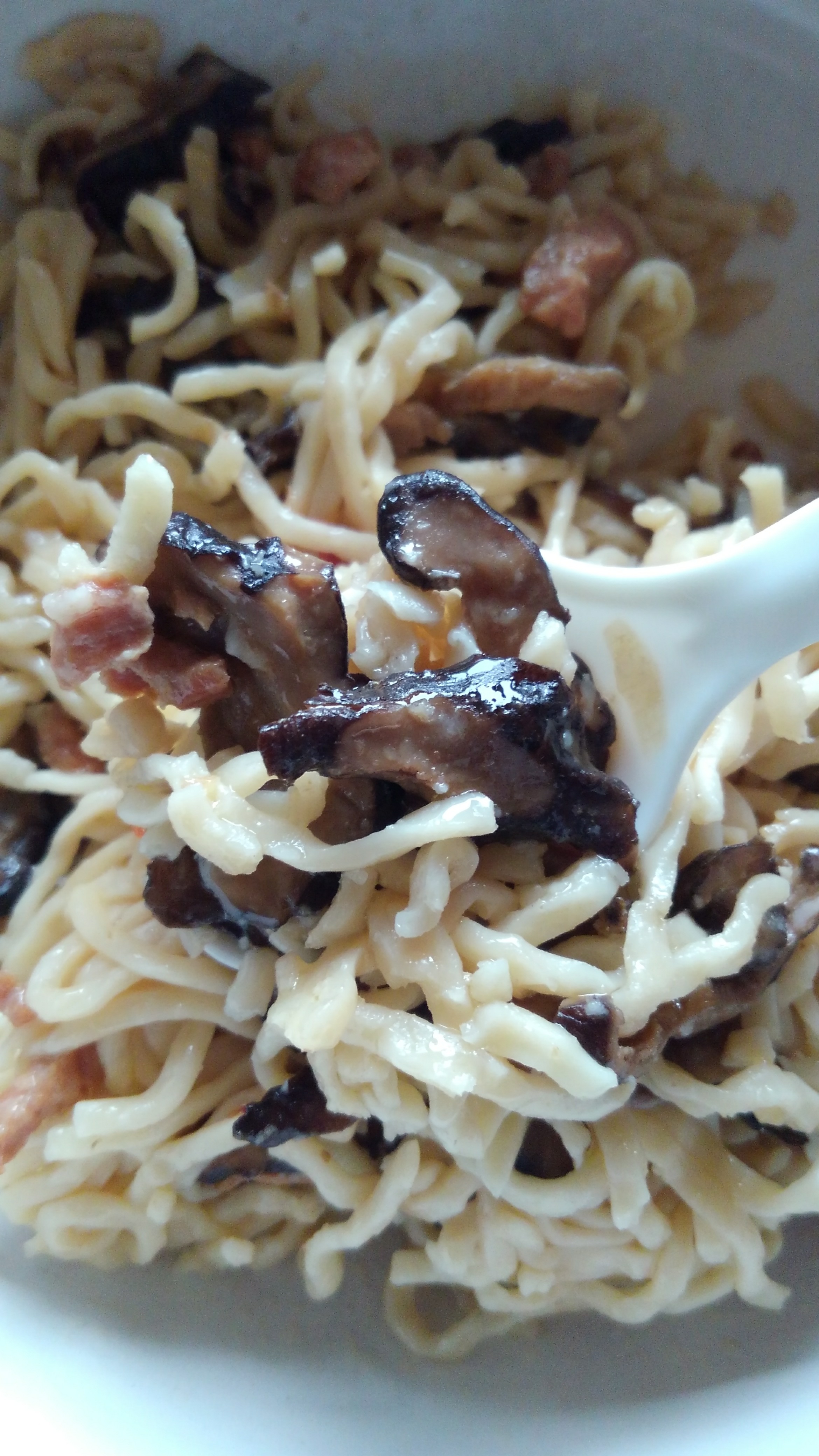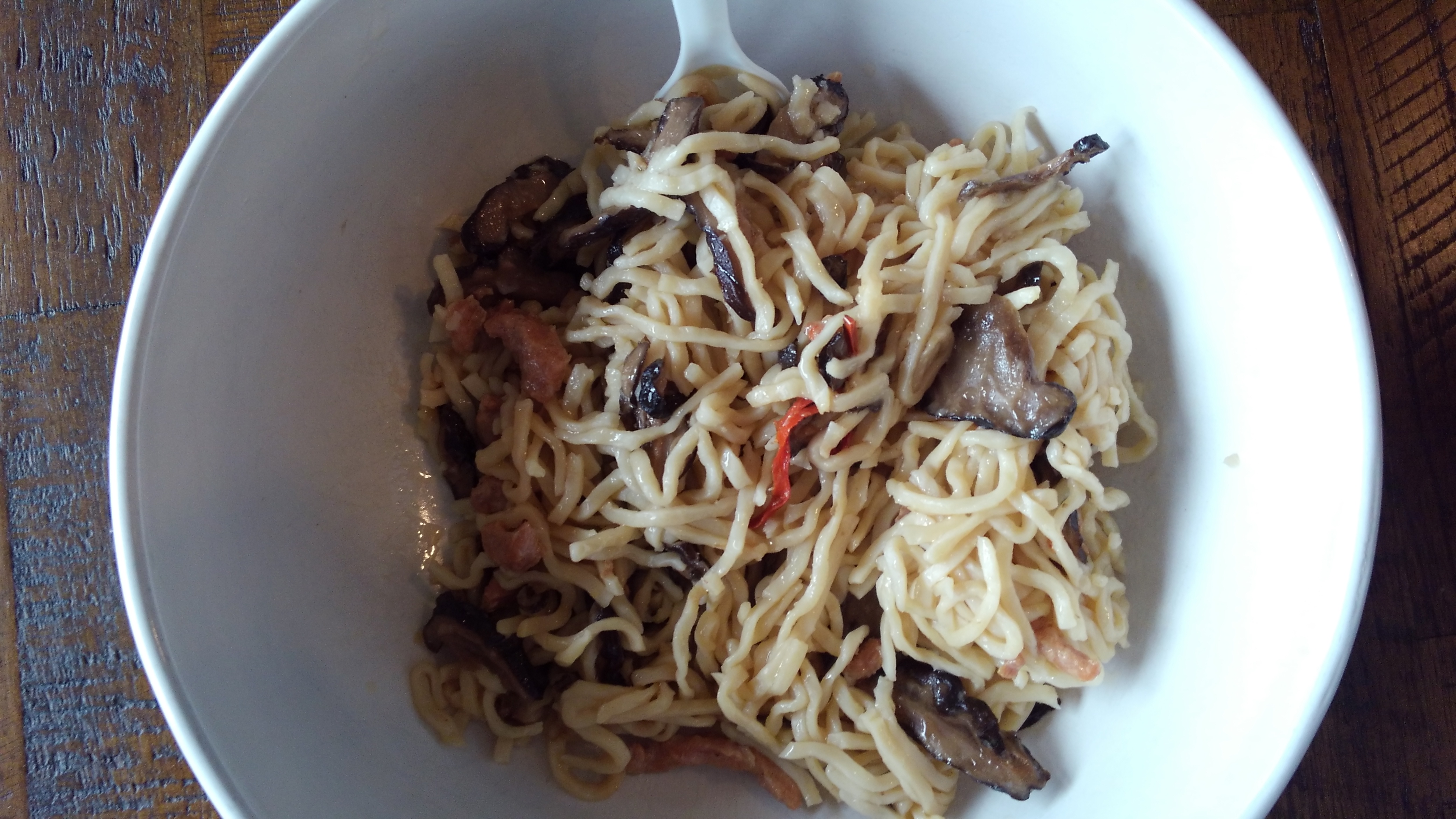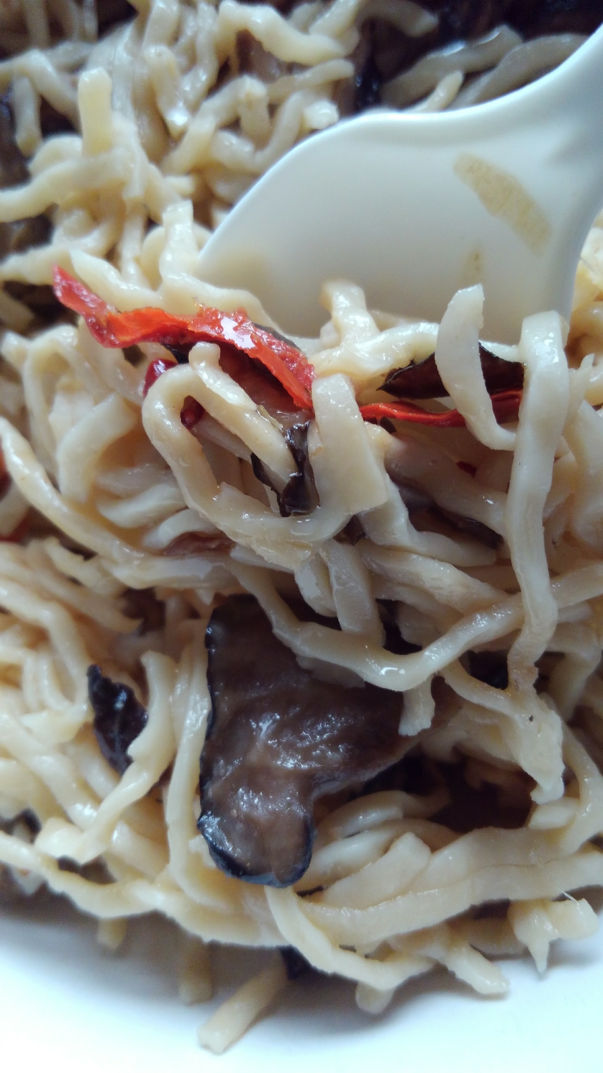 The larger main was 300 grams of shiitake noodles. "Wheat flour, pork, vegetable oil, shiitake mushroom, onions, peppers, edible salt, white sugar, chicken essence, soy sauce." After kneading the package a bit to break up the noodles, they poured out looking very tasty...