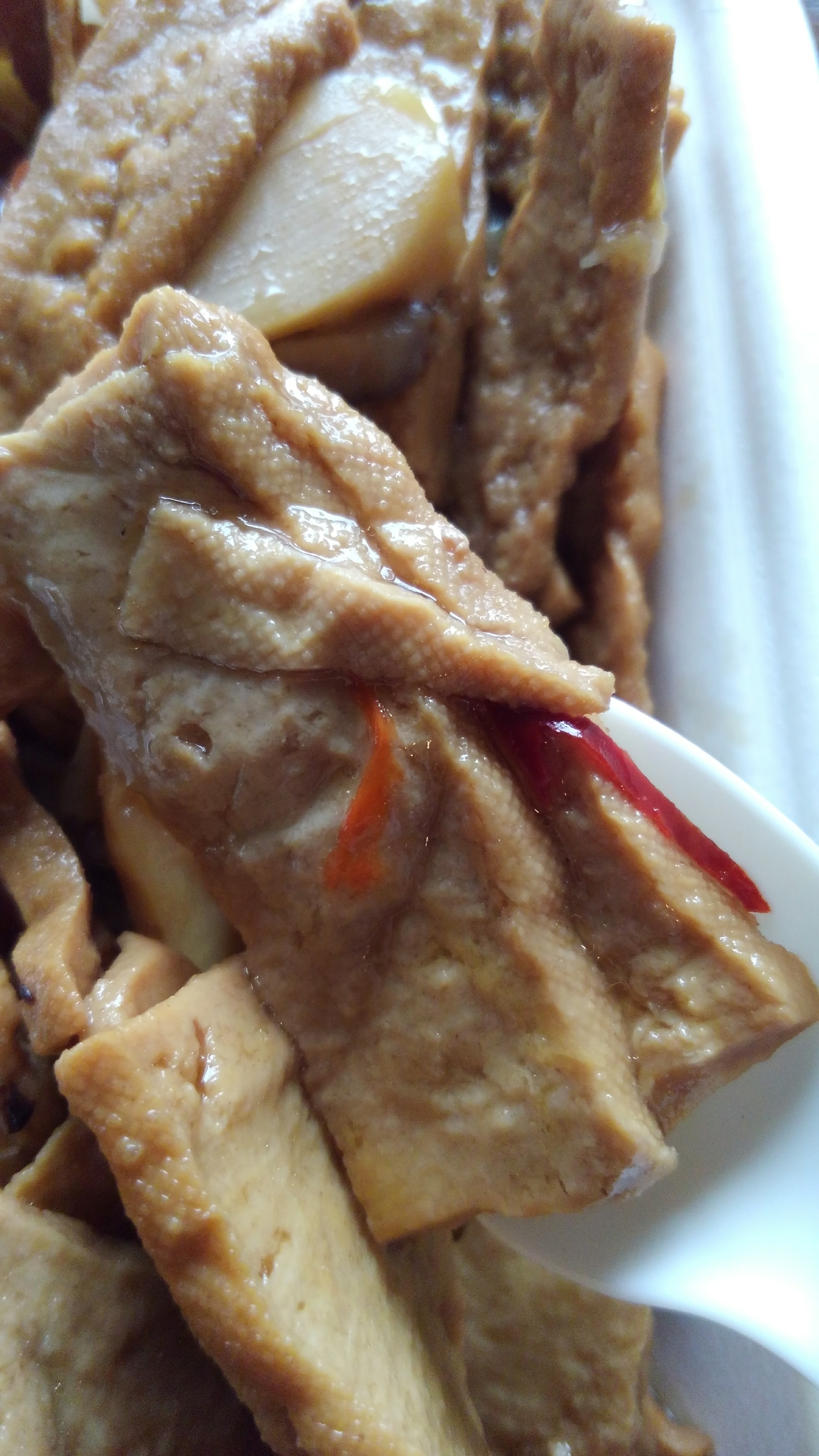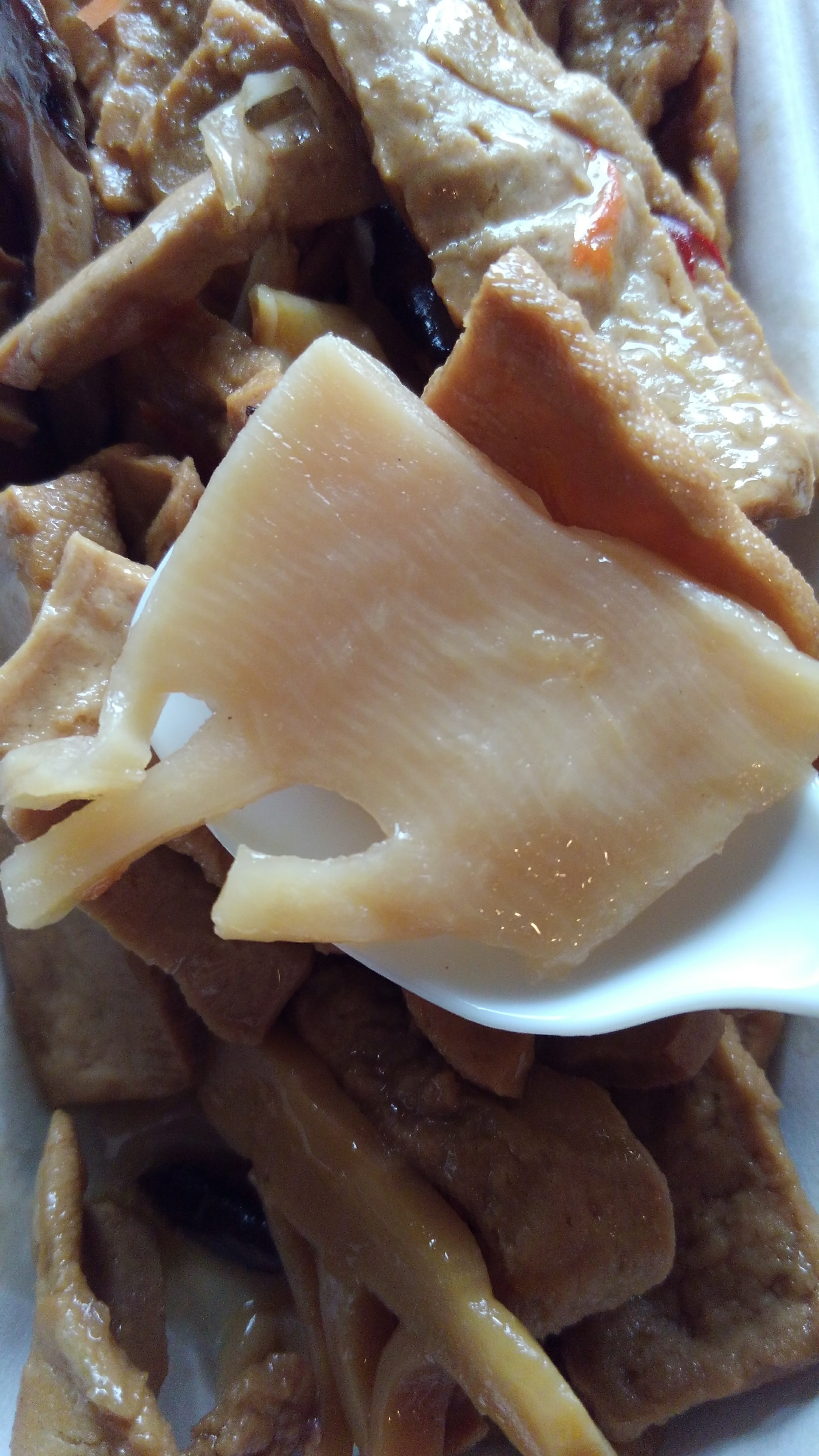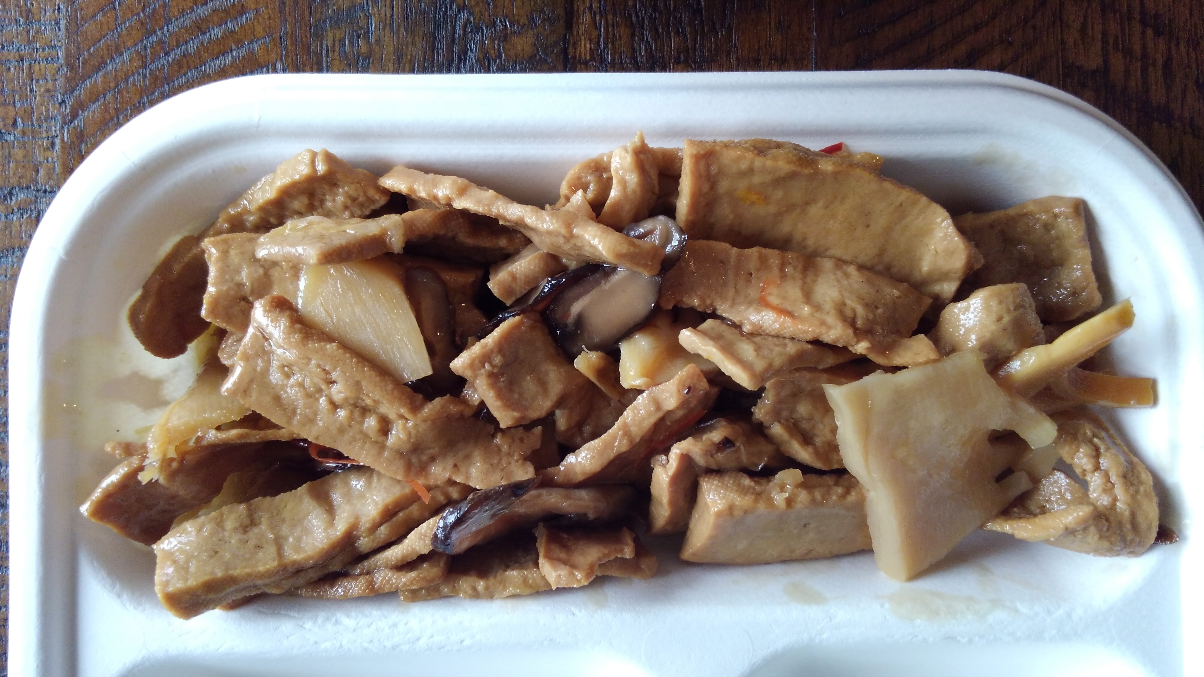 The second main was a 200 gram blend of tofu and vegetables. "Dried incense, winter bamboo shoots, mushrooms, daylily, seasoning." I assume the "Dried incense" should have translated as tofu, because that was the majority of strips in the mix.