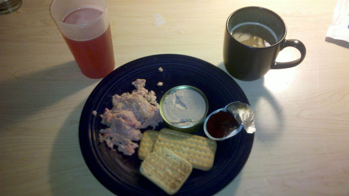 I had one of the biscuits with the pate and thought they paired excellently. I had another with the chicken (good combo), a third with the jam (grand!) and the fourth covered in sweetened condensed milk. I'd seen Big_jo's review of a Polish W Type Ration here and figured the combination was worth a try. Overall the biscuits brought up a semi-nerdy memory from reading the Lord Of The Rings when I was young. They eat like what I'd assume lembas bread from LOTR would - tough but not stale - just dense. Of course they're not magical and one bite definitely doesn't fill me up, I had to eat every last piece of this ration to get to that point!