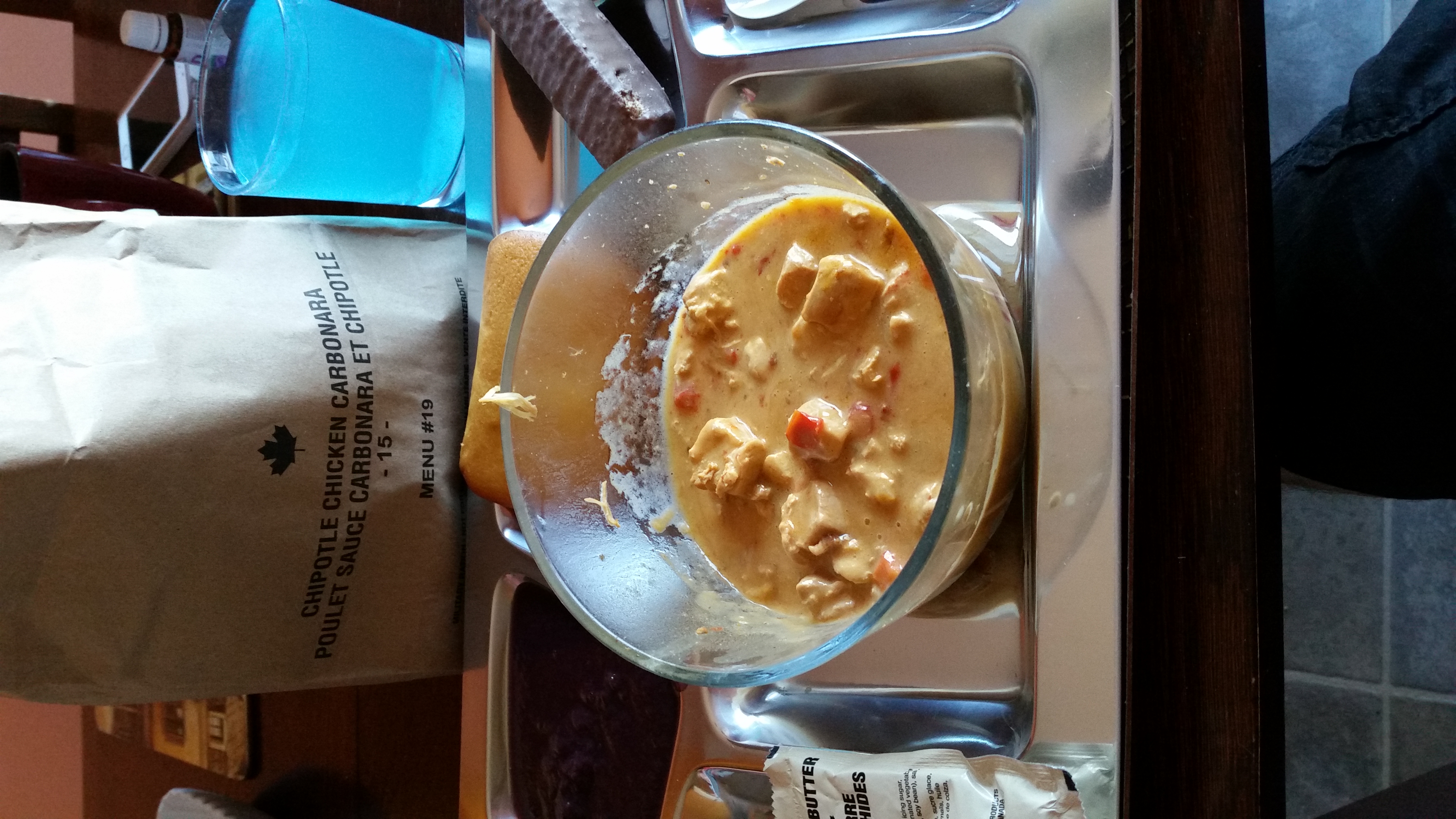 We've got the Chipotle Chicken Carbonara main entree, cornbread, blueberry applesauce, a Coffee Crisp bar, Ice flavoured beverage powder, peanut butter and strawberry jam. Not pictured is all the other extras, like the beverage bag, coffee, whitener, sugar, hot sauce and whatnot. I didn't use any of that stuff, especially since I don't drink coffee.
