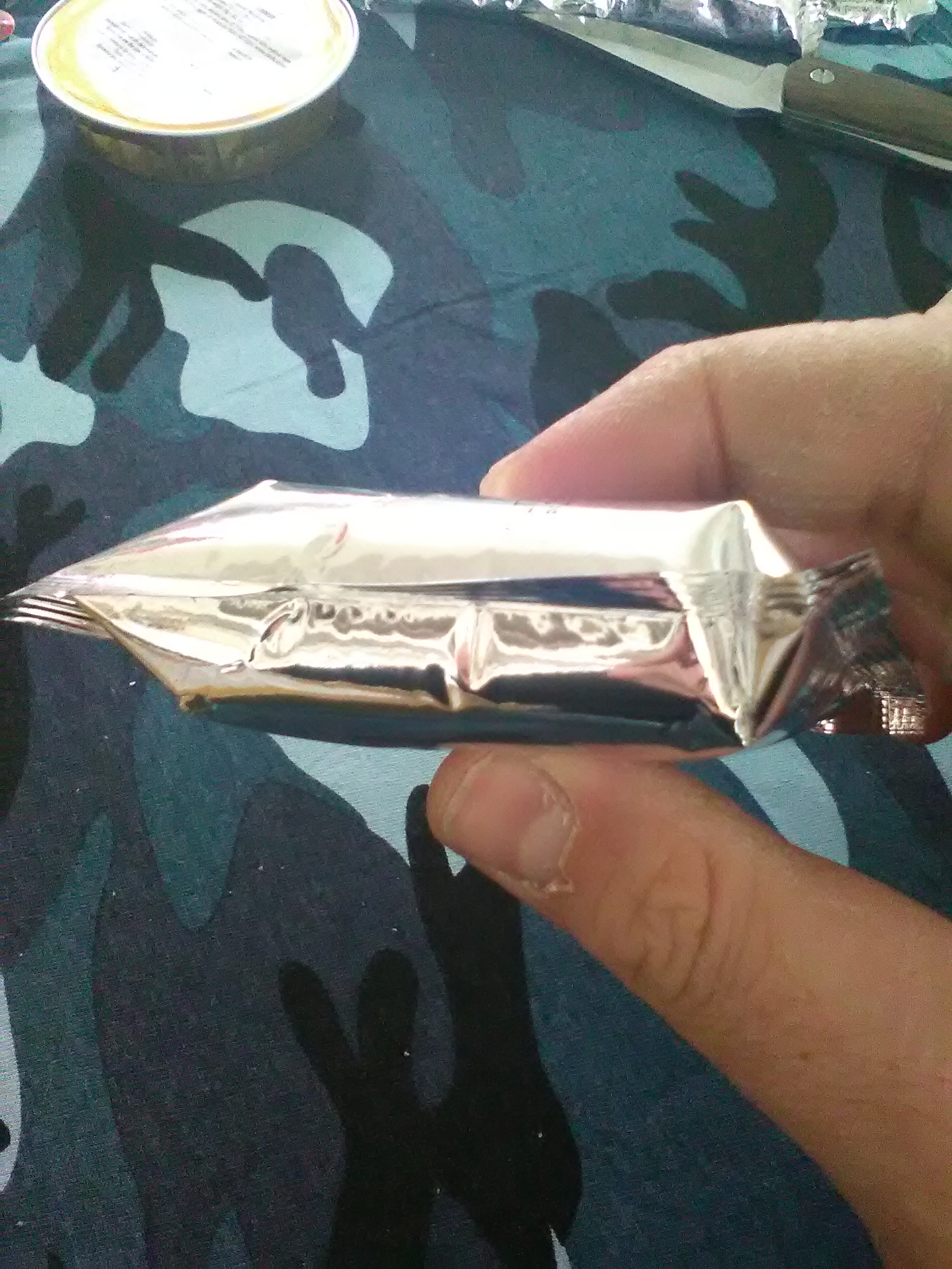 On opening up this ration I removed and inspected the contents. Unfortunately there was a slightly foul smell coming from something. It turned out that the lunch meat was compromised. It seems to have leaked through the top of the foil container. There has also been significant moisture ingress, whether from the lunch meat leaking or otherwise.