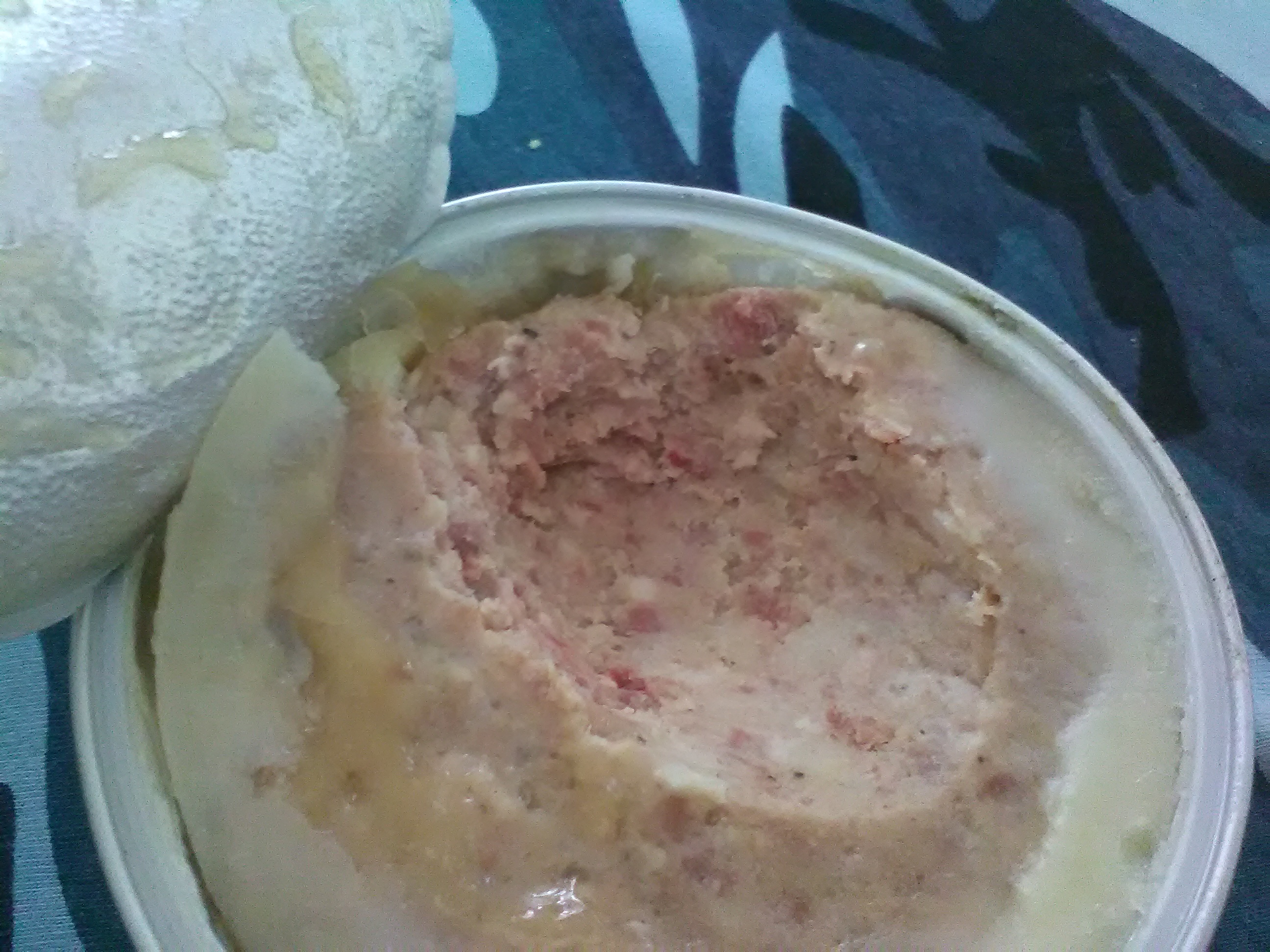 Next i opened the lunch meat, this looked alright but smelled bad. It's state of dereliction was confirmed by my cat, who sniffed it when a piece was offered to him, took a lick of the fat/jelly part then batted it away with a paw in disgust. Unfortunate.