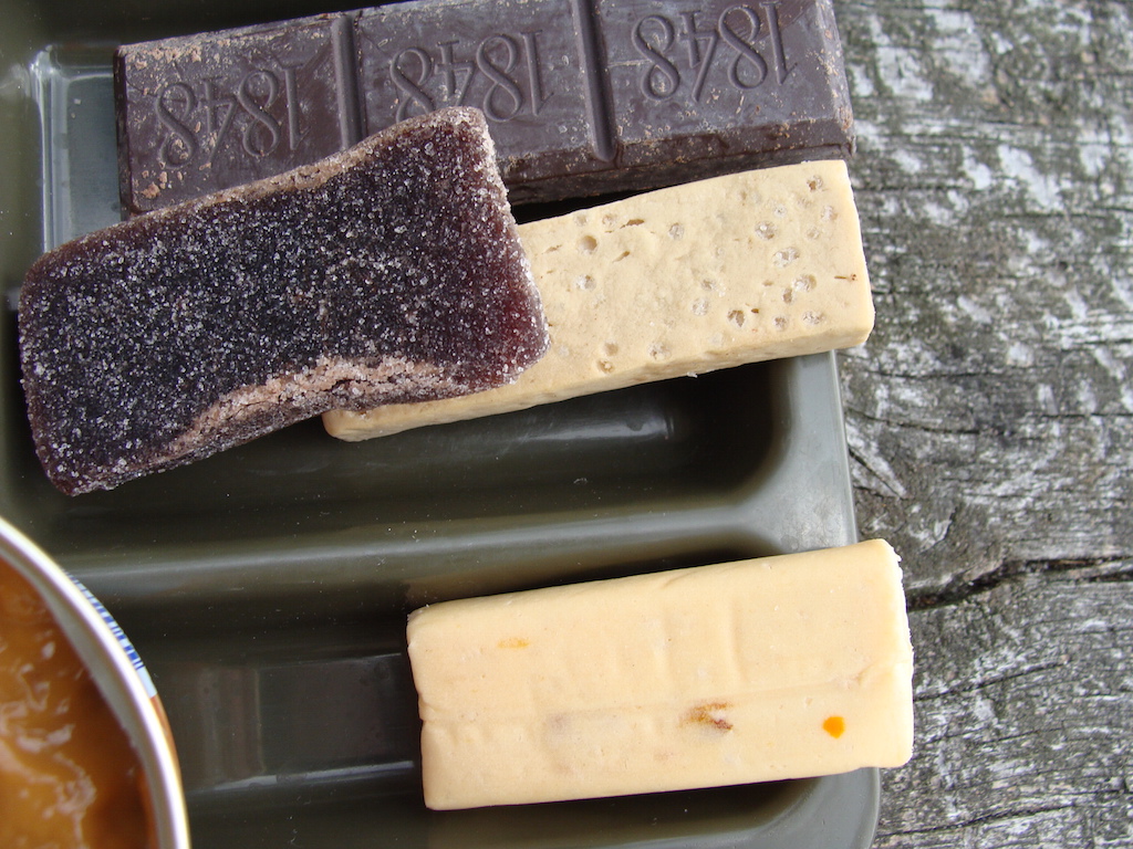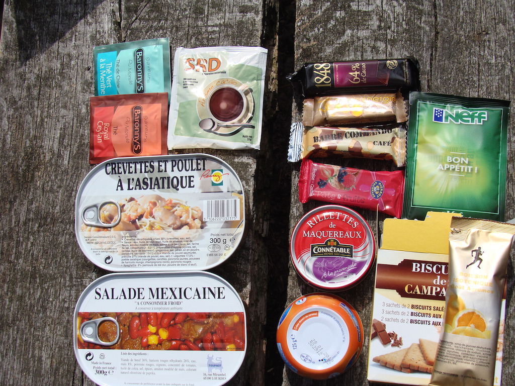 the content of the ration The breakfast- muesli, coffee, chocolate crackers with plum jam and the fruit nougat The lunch/dinner part Lunch/dinner prepared: left to right