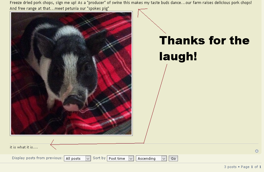 sourwes wrote:Freeze dried pork chops, sign me up! As a "producer" of swine this makes my taste buds dance...our farm raises delicious pork chops! And free range at that...meet petunia our "spokes pig"