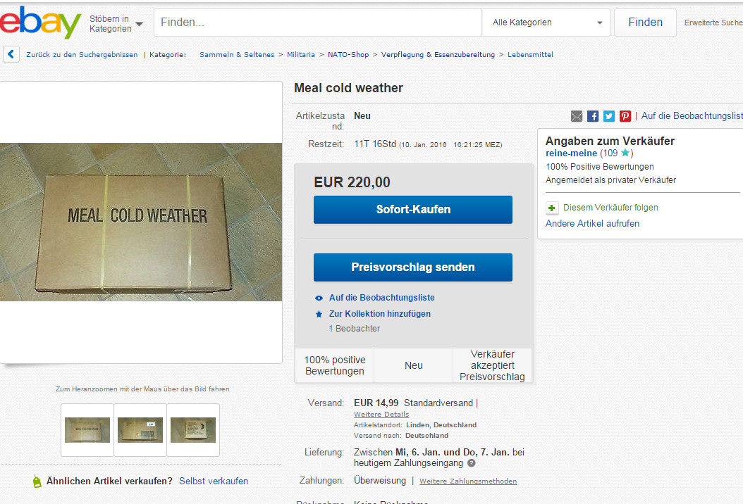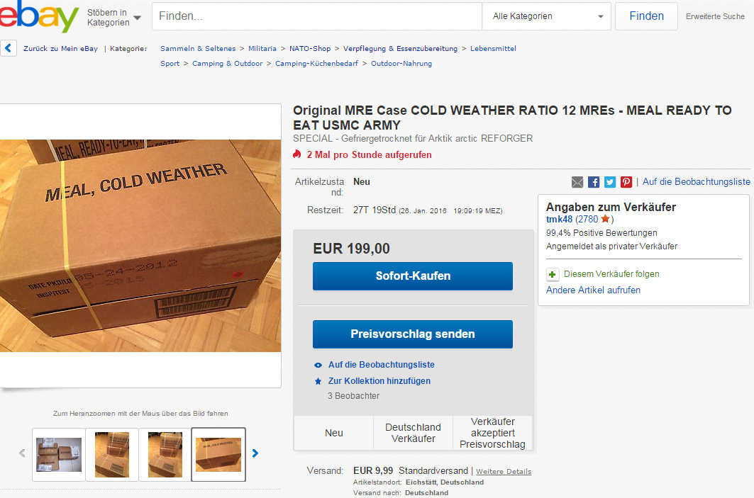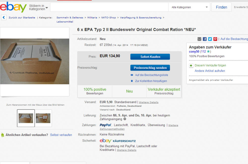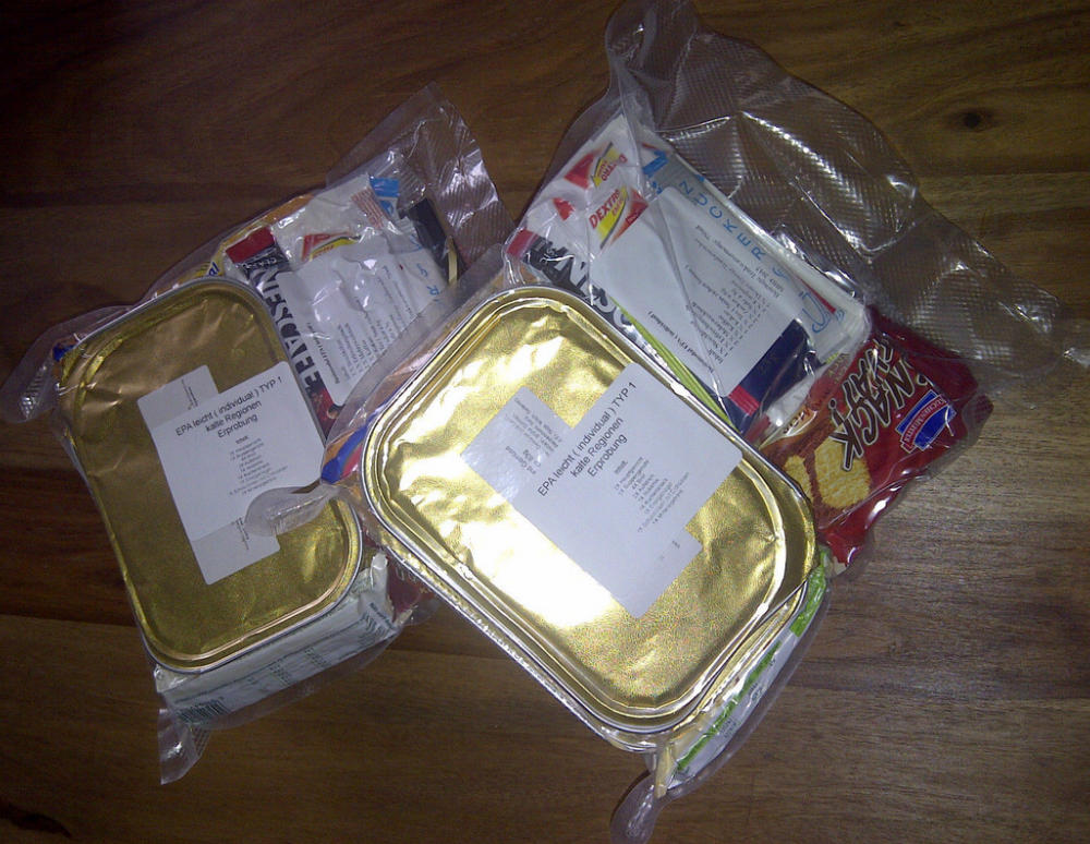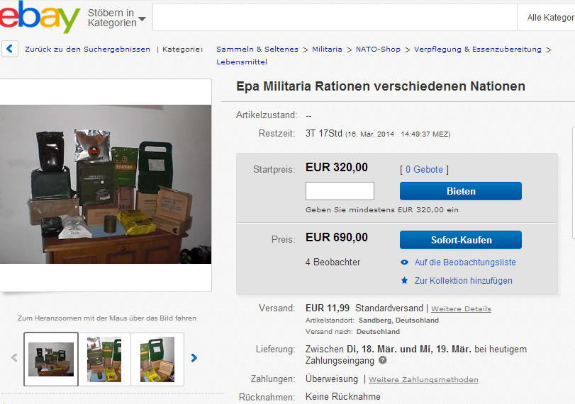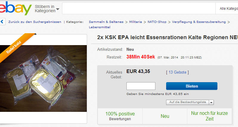 Go to a grocery, buy some instant coffee, sugar, a EPa looking entree.... print a label call it "KSK" (= the SEALs of the German Army) and sale them for +€43 to a moron...