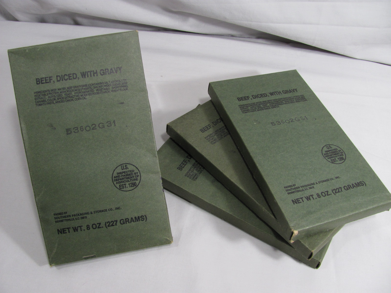 What do you need to know? The boxes are sturdy. No water damage. The contents feel... like there's a package of liquidy stuff in a bag inside. All four are stamped .69 cents on the side. My mother is a gem of a woman.. and they've been in dark dry storage in her kitchen pantry for years. She cannot recall where or when she got them. She left the army around '77, shortly after I was spawned, so all I know is that they weren't originally hers.