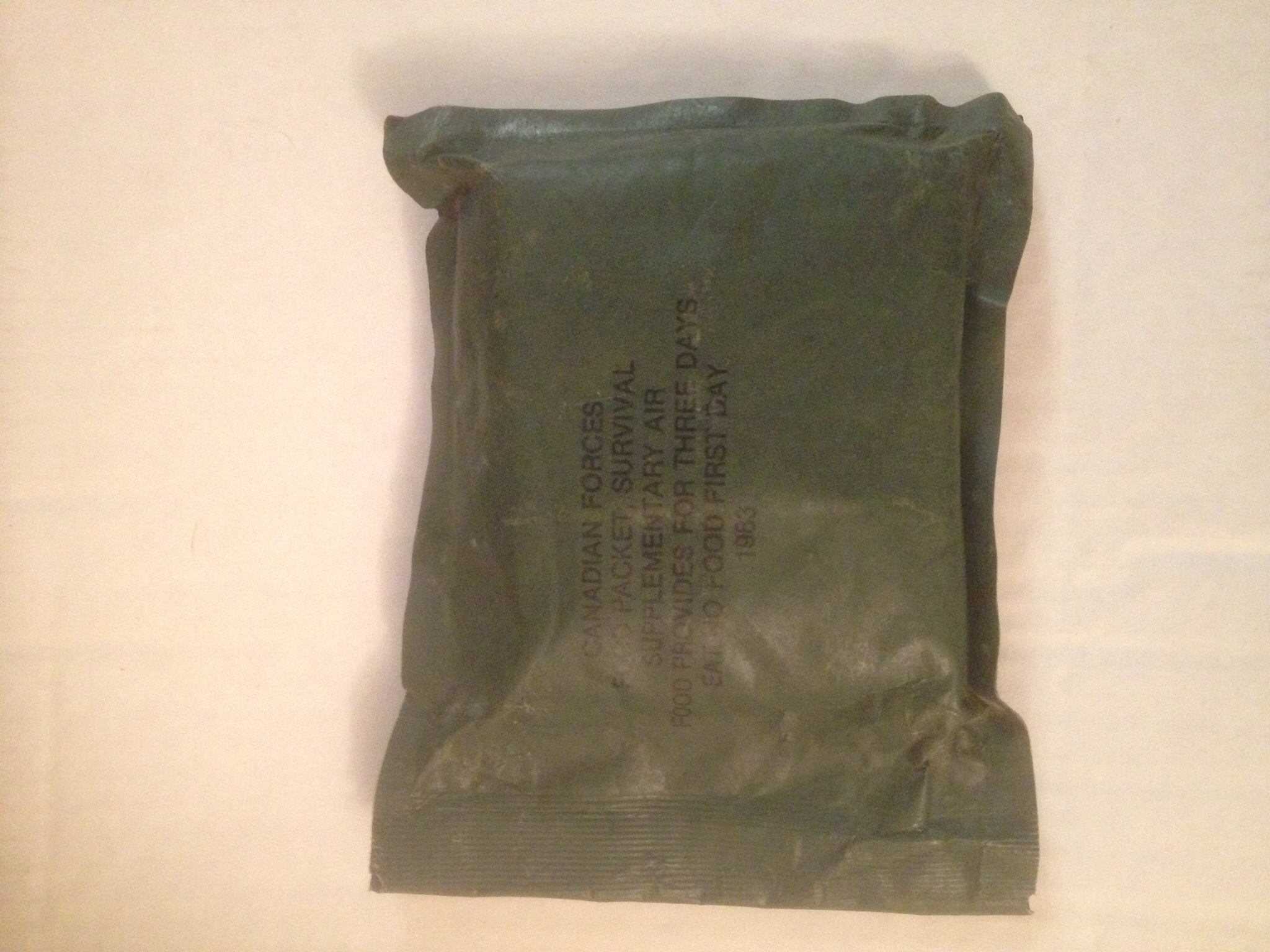 Canadian forces food packet,survival supplementary air 1983. Outer pack has been opened. Inside is rubber banded twice and looks to be original un messed with.