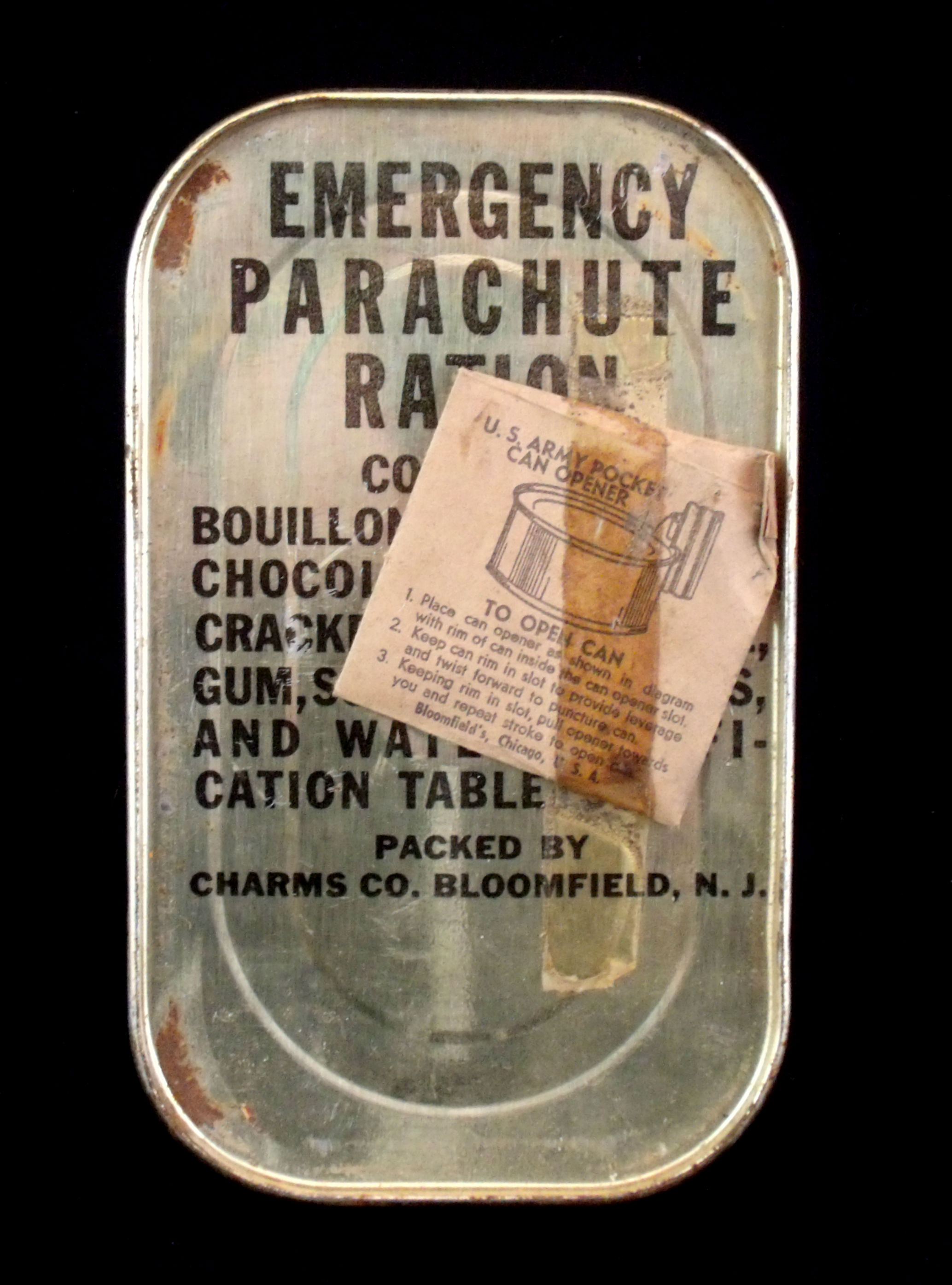 I'm donating this Emergency Parachute Ration - perfect for a C1 Survival Vest display or a general ration display. It's in great shape, undented, nearly rust-free, with an attached can opener.