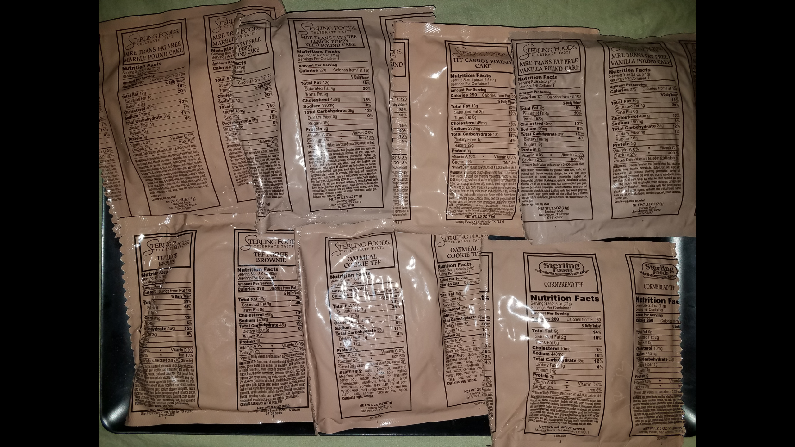 I HAVE 10 FRESH RATION SIDE/SNACK POUCH BUNDLES AVAILABLE!! PACKED IN 2016 (SOME EVEN THE LAST FEW DAYS OF THE YEAR). ALL THE FAVORITES(CORNBREAD, LEMON POPPY POUND CAKE, OATMEAL COOKIE, ETC)! I WILL SAY THEY ARE INCREDIBLE. NEVER HAD THEM SO FRESH. MOIST AND SPONGEY, THE OXYGEN ABSORBER DOESNT EVEN LEAVE AN IMPRINT! THEY COME IN SINGLE SERVE POUCHES (JUST AS FOUND IN RATIONS). THE BUNDLE CONTAINS THE 7 DIFFERENT ITEMS BELOW! BE ABLE TO TRY ALL THE POPULAR, AND HARDER TO GET ITEMS ALL IN ONE SHOT!