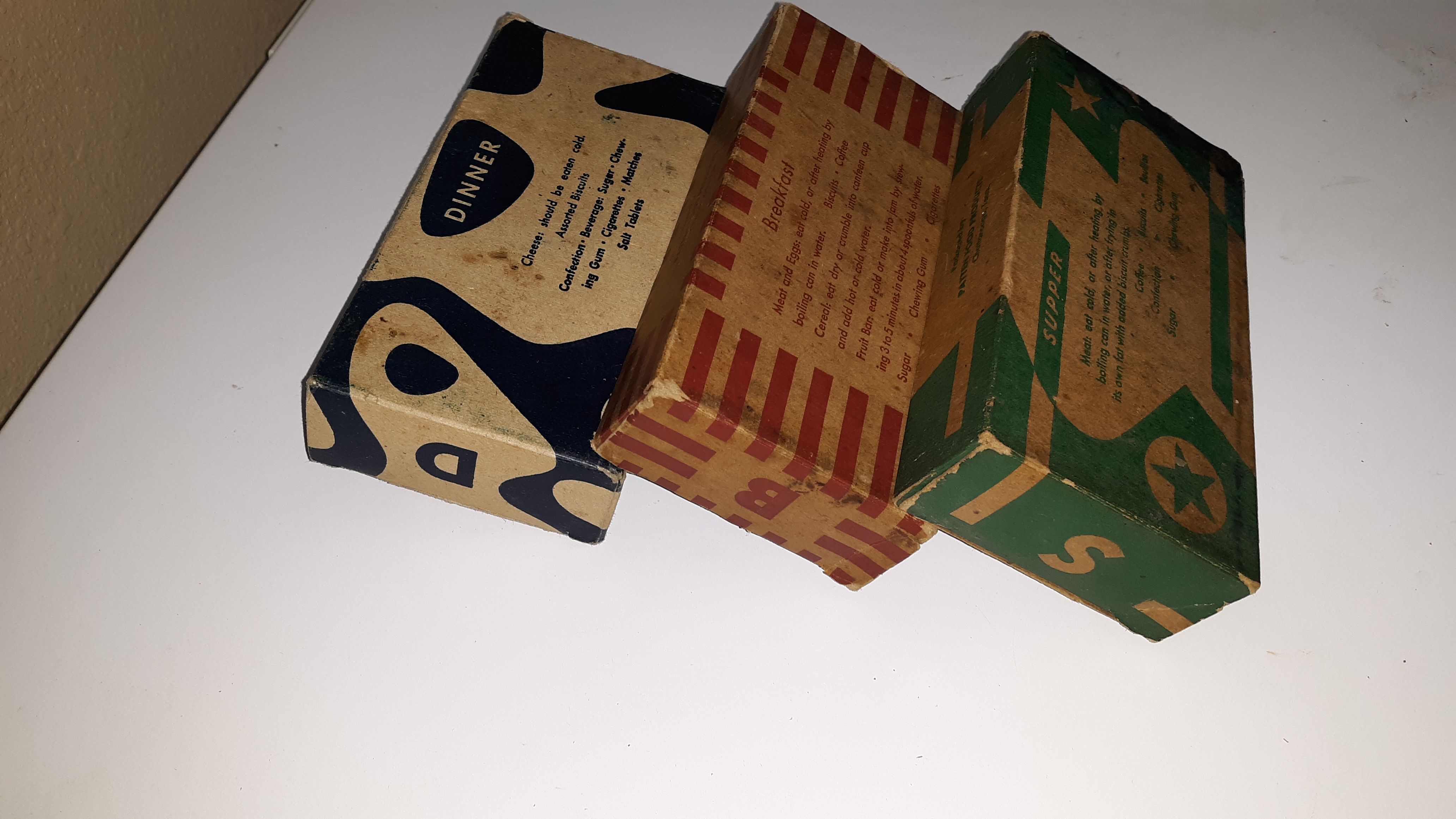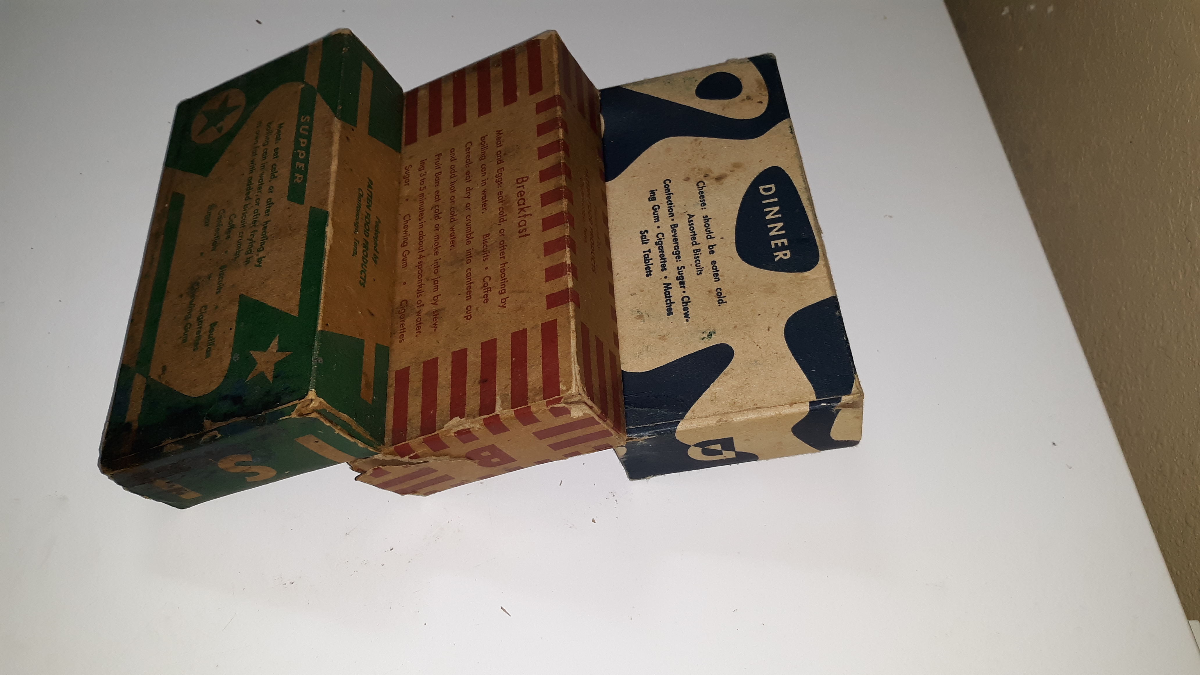 First i would like to say that i am some what new to k rations and c rations and mres. What i need advice on is i just came into a complete set of 1945 k rations the breakfest unit dinner unit and supper unit i am looking to sell them what would be the best way to sell them sell one by its self or as a complete set any advice would be good thank you sorry for the pics best i can do for now