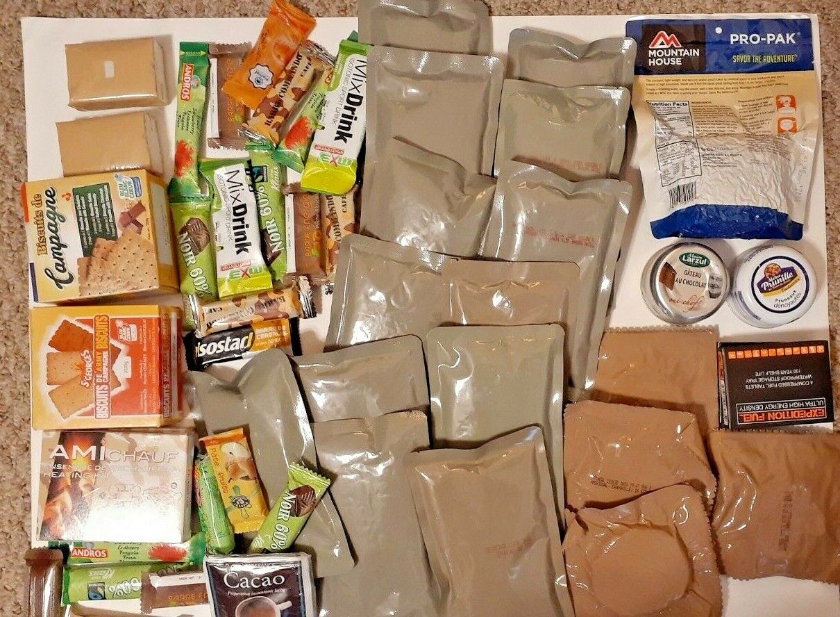 Mystery Box! A large flat rate box filled with MRE and MRE components. I have new American MRE's mains that expire in 2021. I have french components that expire in 2023. I also have American components and gadgets, freeze dried food and many more! Each box is unique with lots of variety. This one has 13 American mains, 26 components (mixture of foreign and American) and other items.