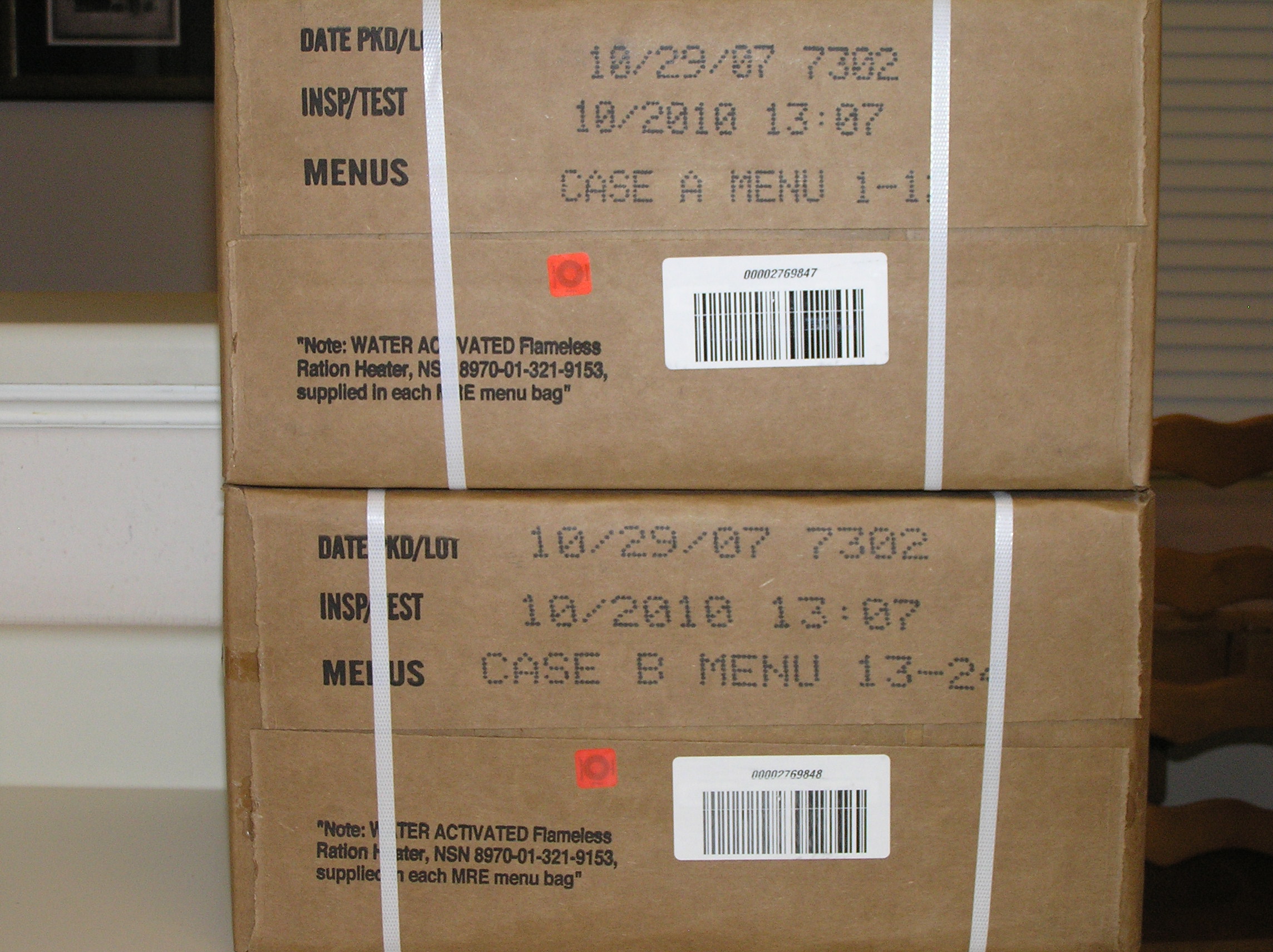 MRE's, anyone looking???? Brand new. 10/10 inspection dates & 04/11. 35cases. new, fresh etc. NOT stolen. kept in 65temp. Genuine Military issue. Cases A & B.. Bands, Time/Temp indicator still on.