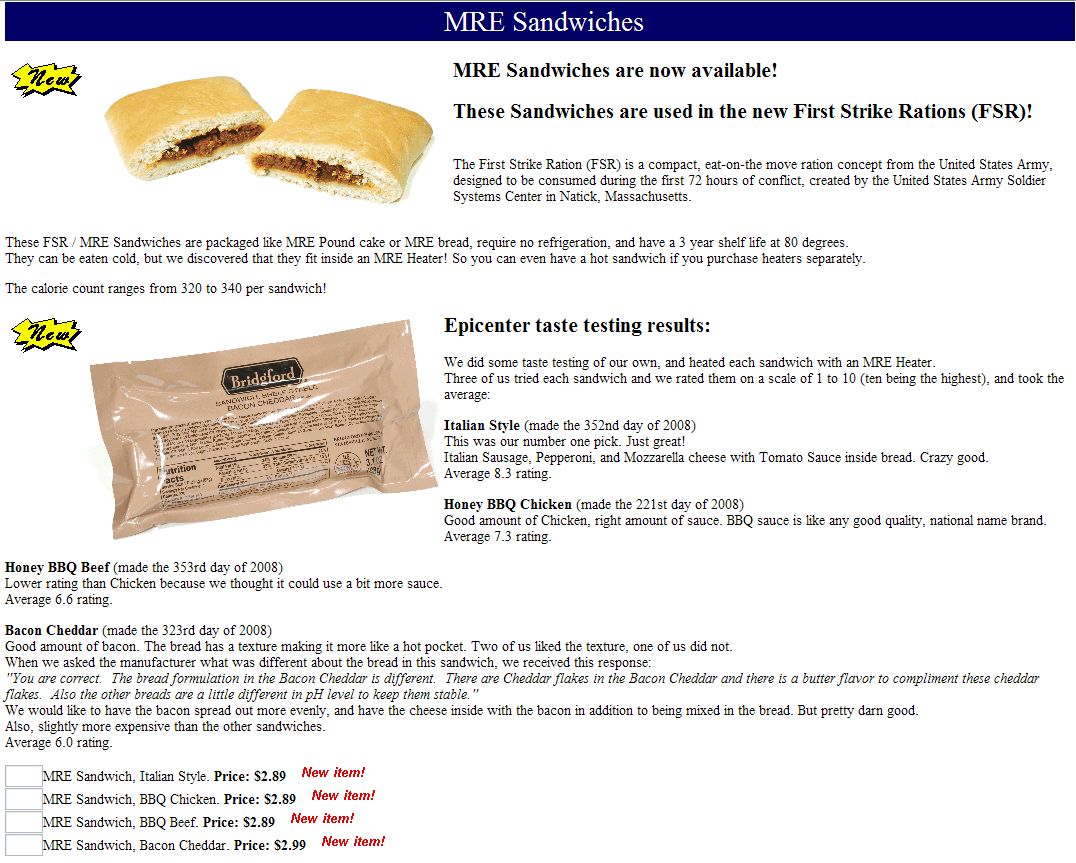 I just received a note from the owner of The Epicenter that they now have all four of the First Strike Ration pocket sandwiches in stock. This is the first time I've seen these for sale and I already have in my first order. Here's the link to their page with all their MRE stuff: