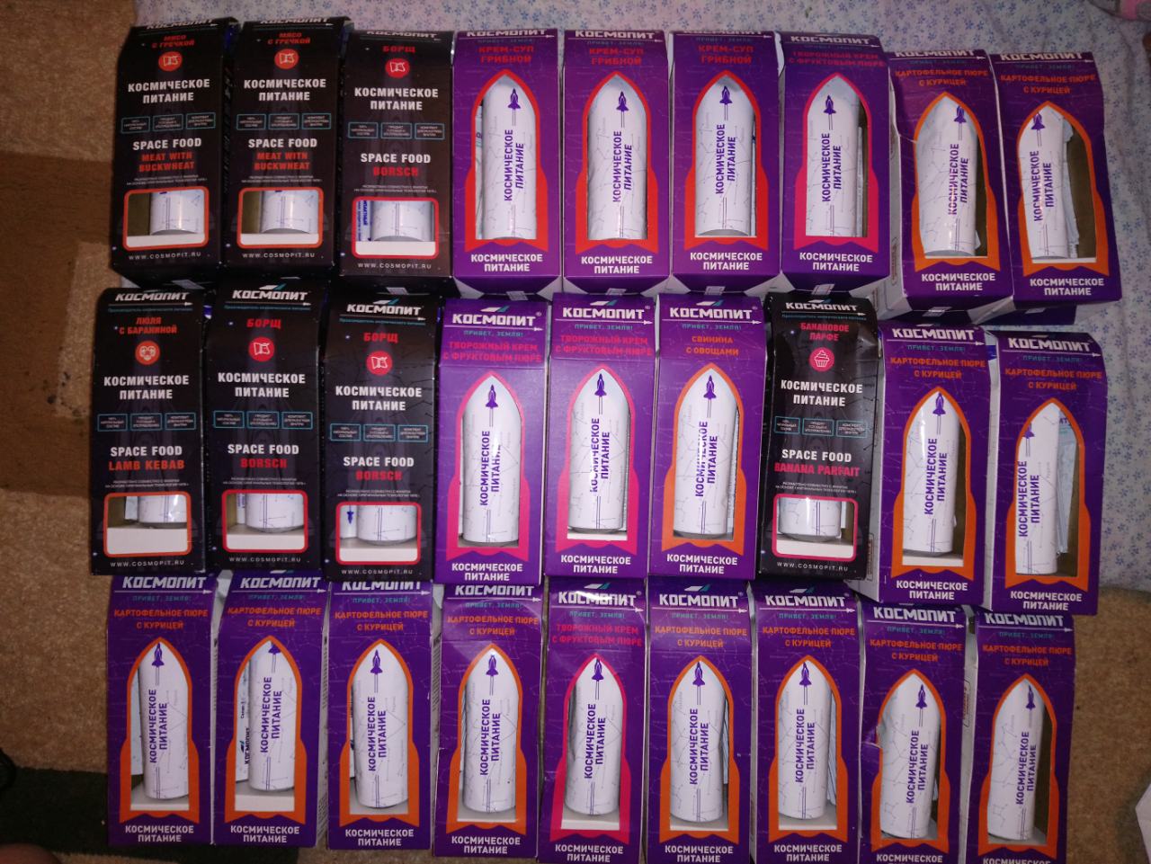 Hi,everybody. I had several 11 Kazakhstan rations and about 20 pieces of space food- first courses, second courses and desserts.