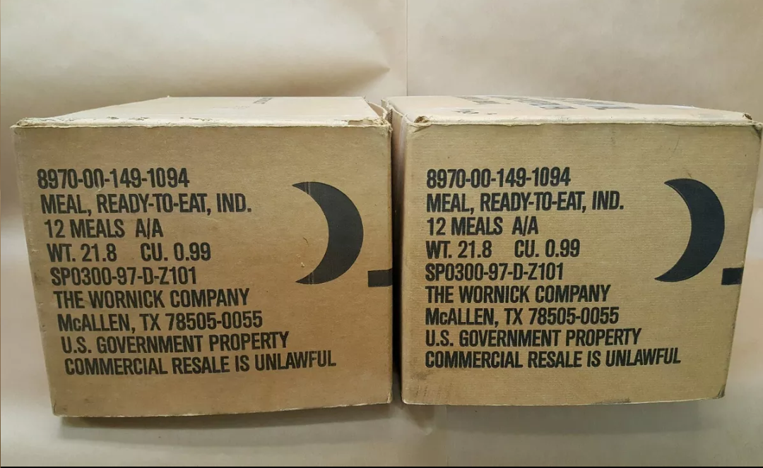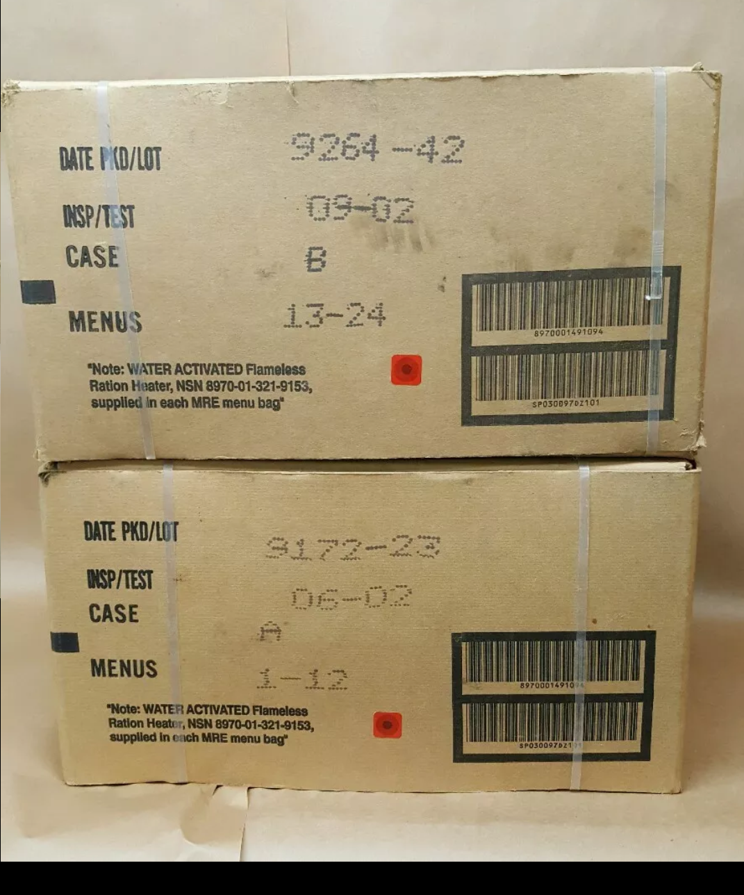 Those cases have a package dates of 264th day and 172nd day of 1999. Contract is from 1997. Those are regular MRE's in the light brown packaging and you have both case A+B so you have all 24 menu's.