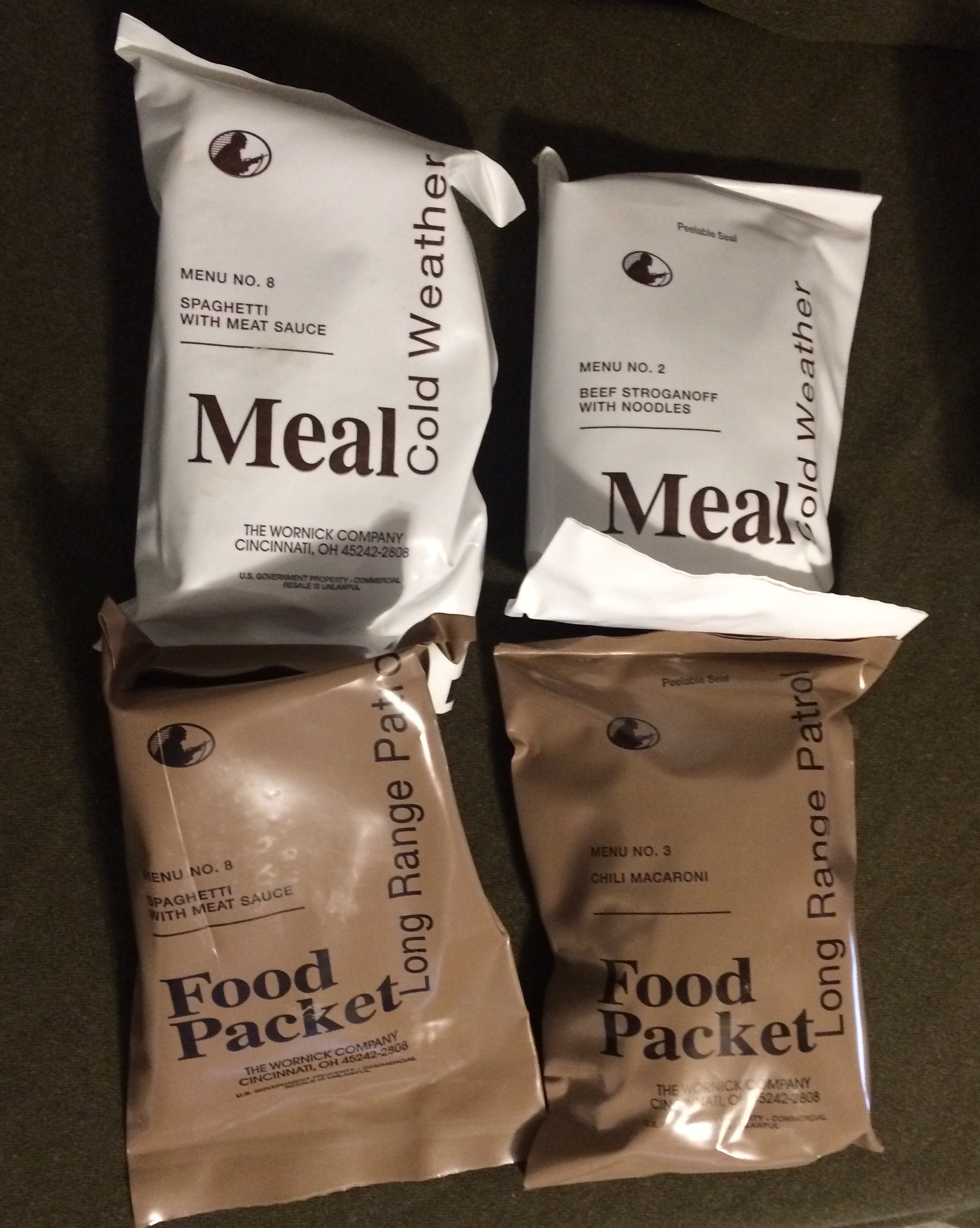 For sale are two long-range patrol rations and two meal cold weather rations. The cost for the lot is $45 + $13.45 shipping (US).