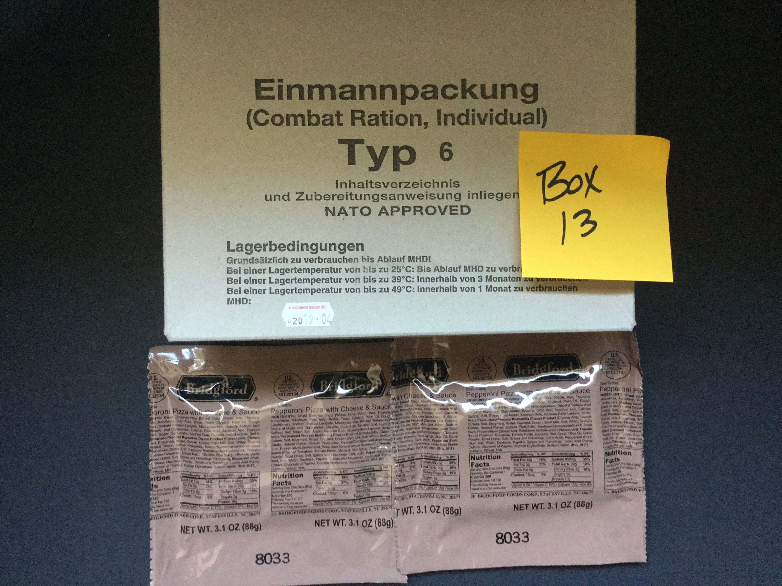 Guys, what goes great with German food? Beer! And what goes great with beer? Pizza! Makes sense that German food would go great with pizza! So, this box contains a German EPA menu 6 (freeze dried mains) BBD 04/19, and TWO pizza slices.
