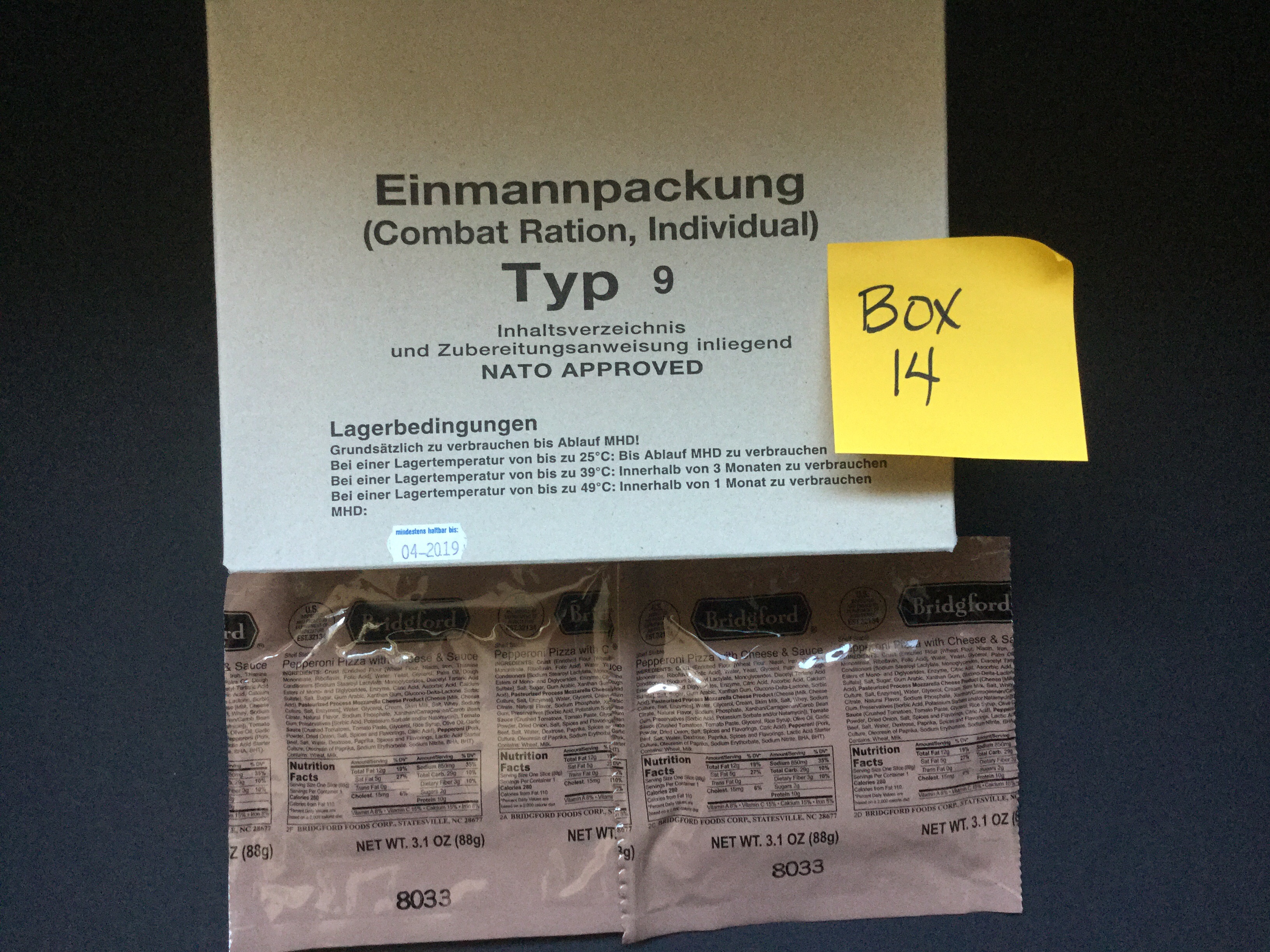this box contains a German EPA menu 9 (freeze dried mains) BBD 04/19 AND two slices of pepperoni pizza!