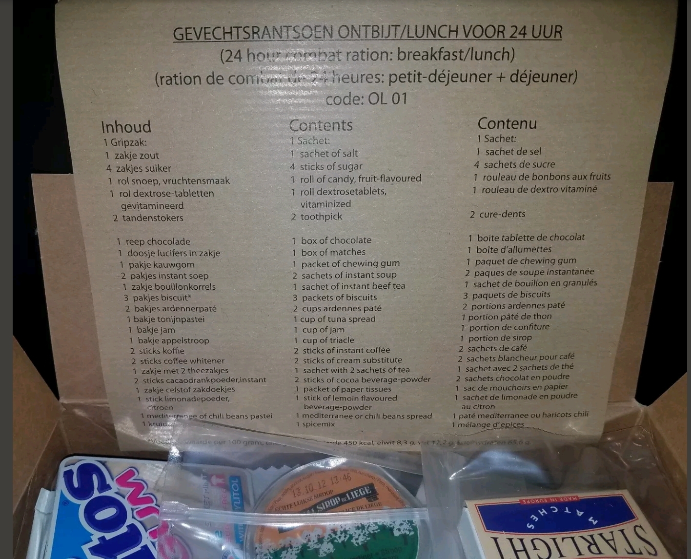 HAVE A 2010/2011 VINTAGE DUTCH RATION (24HR B+L IN THE BOX). THIS VERSION PREDATES THE 24HR B+L BAG RATION, WHICH PREDATES THE CURRENT BASE MODULE VERSION. THIS IS A BRAND NEW AND WELL STORED RATION I JUST OPENED TO TAKE PICS TO SHOW. DEFINITELY A COOL COLLECTIBLE FOR THE HARDCORE RATION HEAD, OR FOR REVIEWERS TO SHOW SOMETHING COOL. I HAD 3 OF THESE, AND ONLY HAVE 2 LEFT (1 WHICH I AM KEEPING MYSELF OF COURSE!! LOL). AS WITH ALL DUTCH RATIONS, THE MAIN ENTREES WERE NOT INCLUDED IN THE PACK, AND WERE GIVEN SEPERATELY(THIS SALE DOES NOT INCLUDE ANY MAINS), WHICH DURING THIS TIME PERIOD, WAS 2 GOLD COLOR TINS(SAME STYLE AS FRENCH MAINS). THIS WAS DONE ALSO IN THE NEXT "BAG" VERSION OF THE RATION, WHEN RETORT POUCHES STARTED BEING USED AND THEN WERE ADDED INTO THE RATIONS, (EVEN THOUGH THEY STILL CAME SEPERATELY). CURRENT RATIONS HAVE DISCONTINUED USE OF THE TINS AS FAR AS I AM AWARE, AS I HAVENT SEEN ANY NEW TIN PACK DATE ONES AFTER 2016.(FEEL FREE TO CORRECT ME IF I AM MISTAKEN). THIS ALSO CONTAINS SOME ITEMS NOT IN CURRENT RATIONS ANYMORE SUCH AS THE CHOCOLATE BAR, SOME PATE TYPES, ETC.
