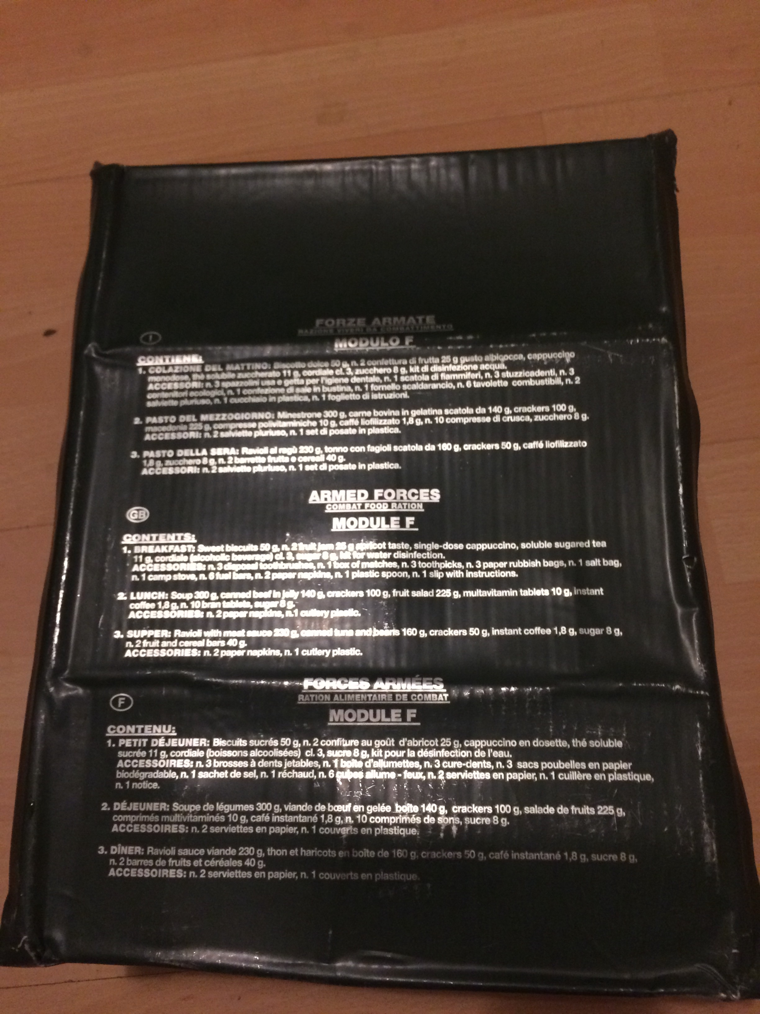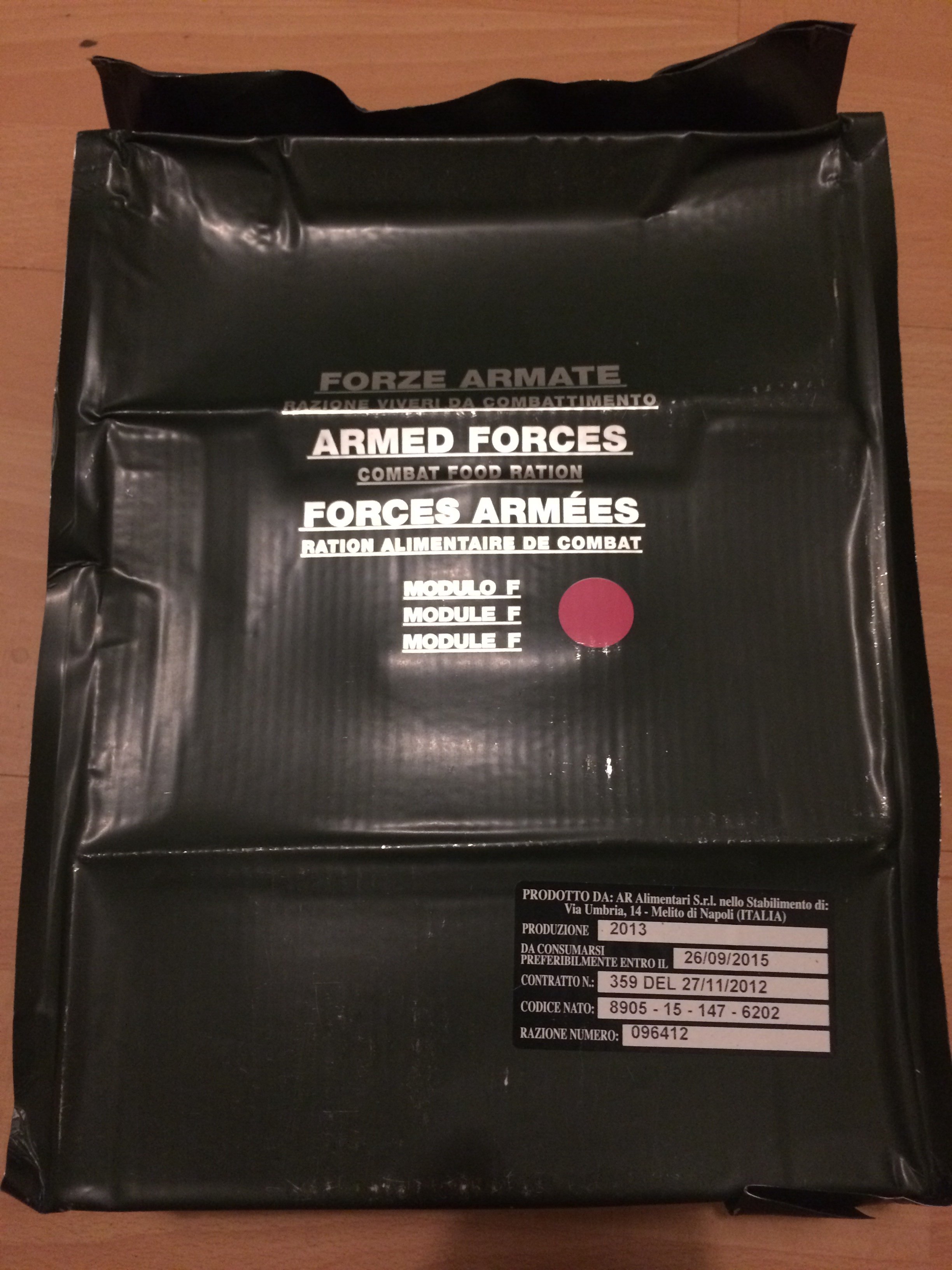 I just got my hands on an Italian Combat Ration Module F (one of the two with Cordiale) the other day and I‘m willing to sell it if anyone is interested. It was produced in 2013 and the outside condition looks very good with no tears or signs of rough handling. I‘m located in Germany and willing to ship worldwide as long as the buyer pays for shipping. Just PM me if interested.
