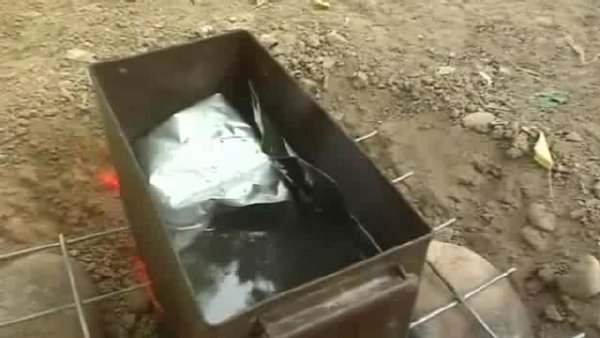 Looks like a modern version of the "Benghazi Cooker," used by the British army in North Africa during WW2. This was a simple stove made from a biscuit tin or British petrol (gasoline, to us Americans) tin. The tin would be cut in half; sand and gasoline were mixed and lighted in the bottom half, and water boiled up in the top half, which was set slantwise on top of the "firebox."