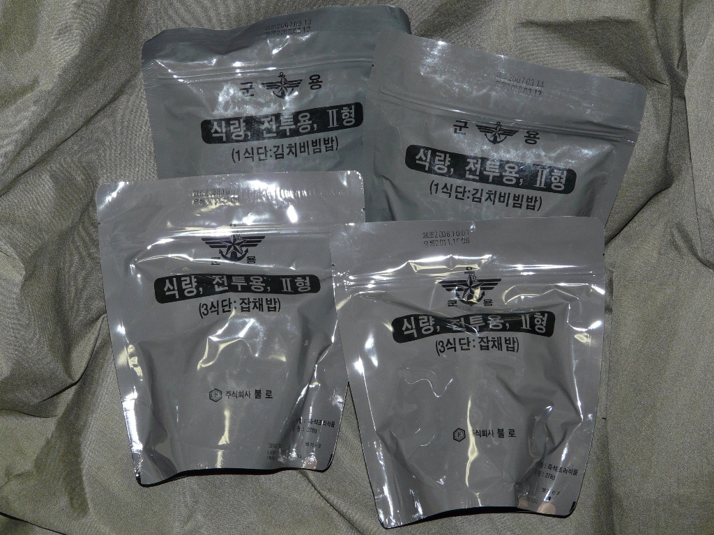 The modern Korean army issues 2 types of field rations, Type I and Type II. Type I ration has ready-to-eat foods packed in foil-plastic trilaminate pouches, placed in turn inside a thin cardboard box. Typical contents include: 1 pouch (250 g) precooked white rice with meat and vegetables, plus a separate seasoning packet; 1 pouch (250 g) precooked rice with red beans; 1 packet (100 g) of 6 pork sausages in BBQ; 1 packet (100 g) kimchi; and 1 packet (50 g) cooked black beans. The Type II ration is a smaller, lighter, freeze-dried single-meal ration consisting of several small pouches packed inside a larger gray plastic pouch measuring 225 x 200 x 90 mm and weighing 278 g. Typical contents include: freeze dried rice (various flavors, usually with meat and vegetables included), a pouch of instant soup, flavored sesame oil, seasoning and spice packets, dried chives and chocolate.