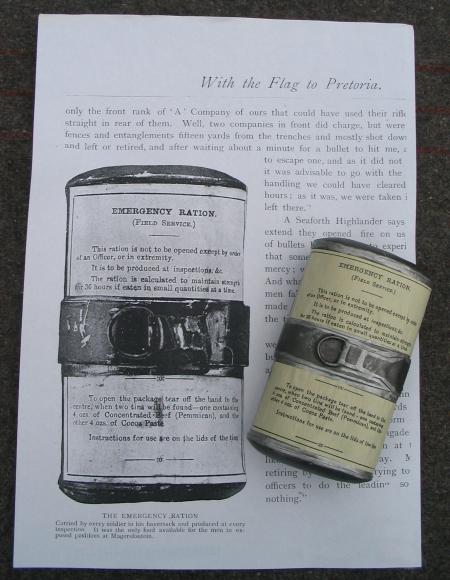 This is the British Emergency ration Field service from about 1900. It has 4oz of pemmican and 4oz of sweet chocolate or cocoa paste at each end. Note the very modern opening device. Its a Victorian ring-pull can basically 8)